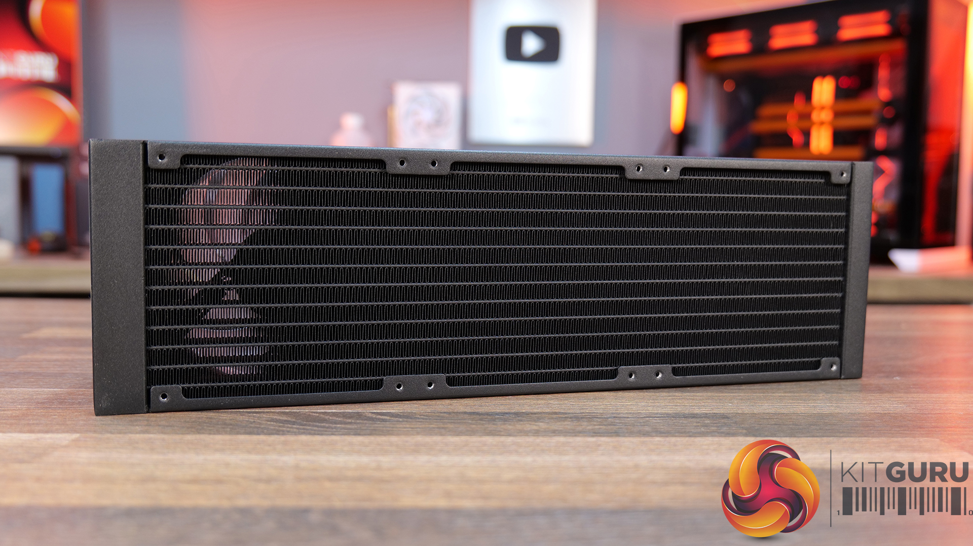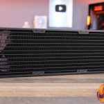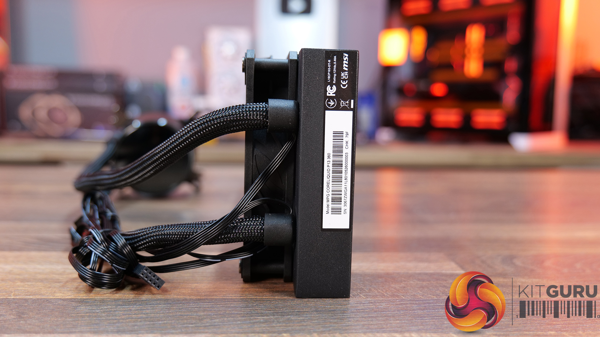 The radiator used in the MPG CORELIQUID P13 360 is a standard 27mm thick aluminium radiator, featuring 12 waterways, a dense fin pitch and fixed tubing on the radiator side. The radiator is covered with a textured, satin finish black coating that appears high-quality. The tubing is fitted with a braided sleeving.