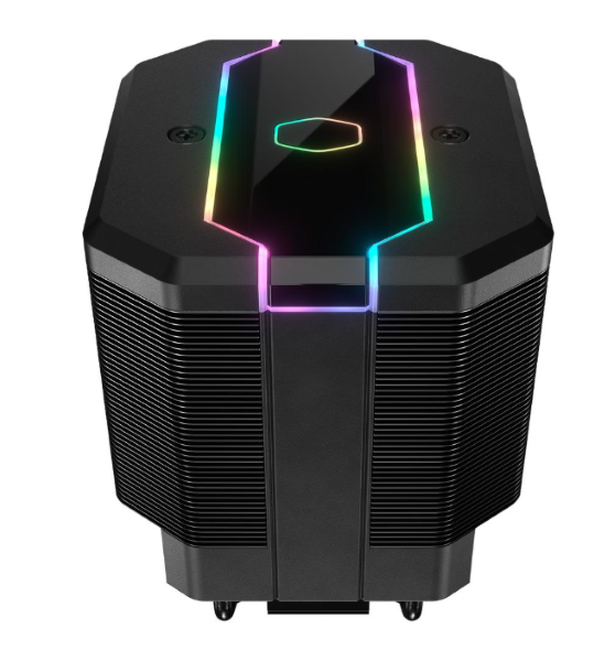 Between the two towers sits a Cooler Master SF12R 120mm high static pressure fan to provide high airflow and silent performance, while maintaining CPU temperatures at acceptable levels. The MA620M is covered at the top with a black plastic shroud featuring addressable RGB lighting and a central Cooler Master logo outline.
