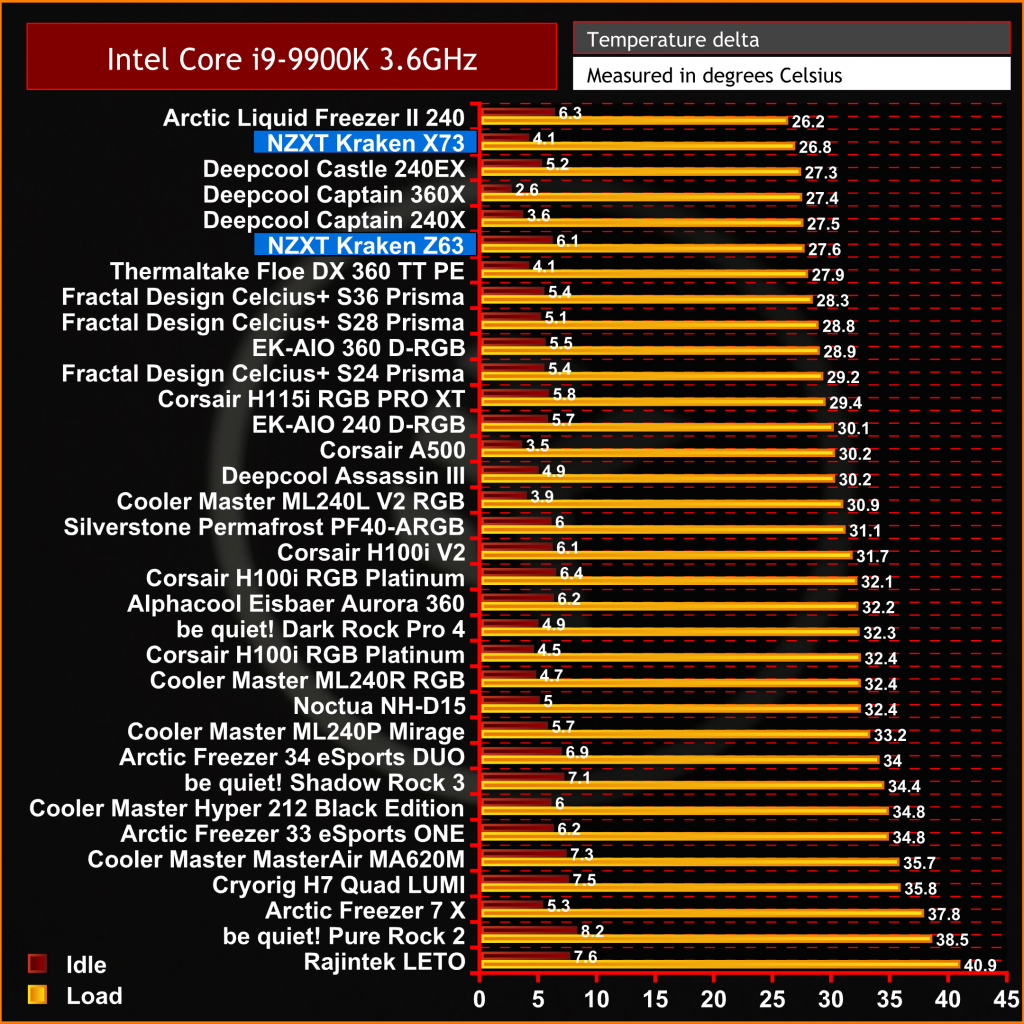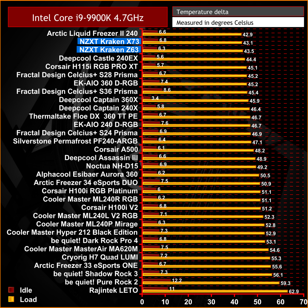 The high thermal performance of the NZXT Kraken X-3 and Z-3 coolers continues during our new noise normalised test. With all coolers set to a noise output level of 40dBA, once again the Kraken X-3 and Z-3 are clear winners, which proves that the thermal efficiency of the cooler as a whole is excellent.