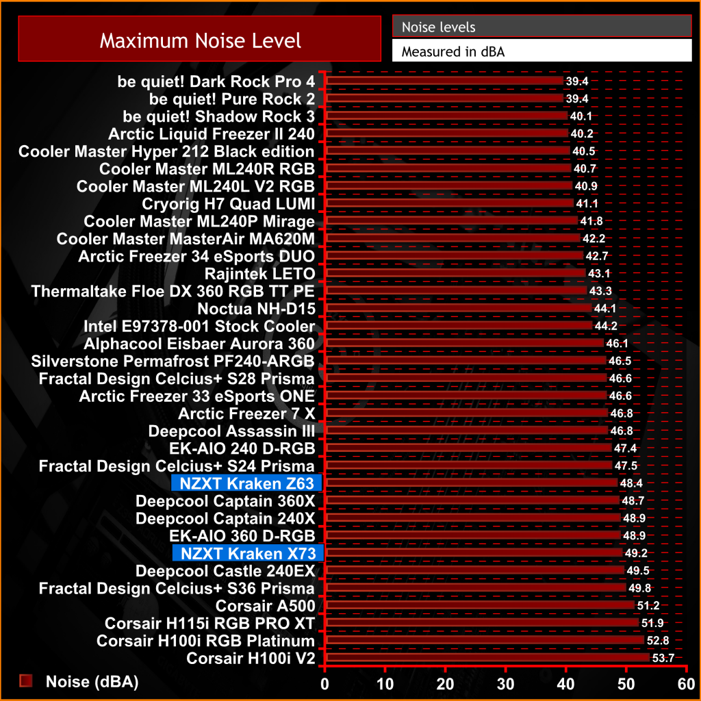 With the fans running at their maximum speed of 1800-2000RPM, the NXZT Kraken X73 and Z63 are on par with similar high-performance all-in-one coolers. Noise output at this RPM is noticeable but not too distracting. As we have seen from the noise normalised thermal performance test, fan speed can be adjusted down and the coolers still provide excellent performance.