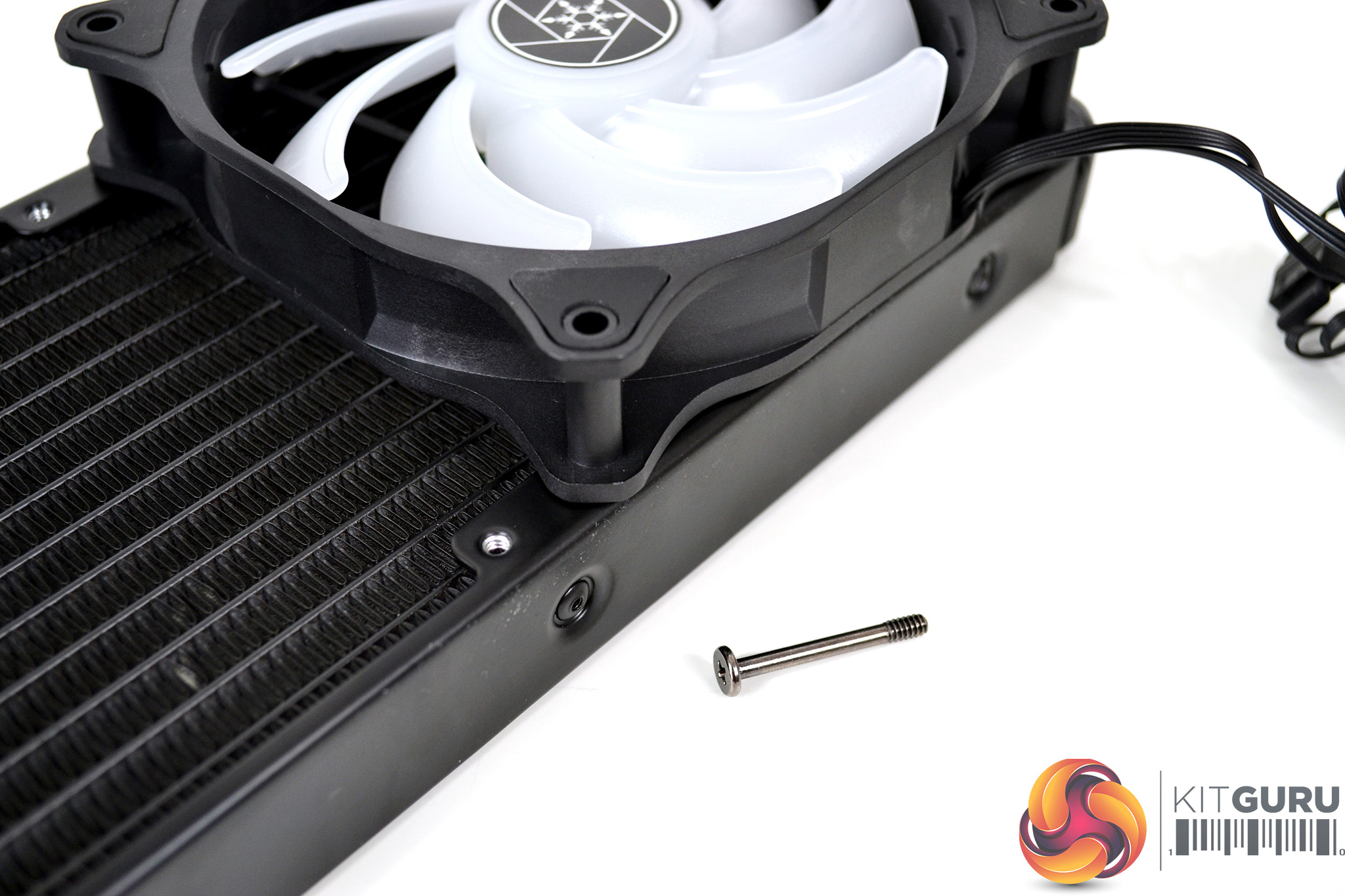 Next, fit the fans to the radiator. Place the fans over the radiator with the mounting holes in both components lined up and install the eight long Philips head screws provided. Tighten the screws down with a screwdriver.