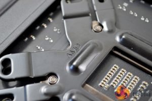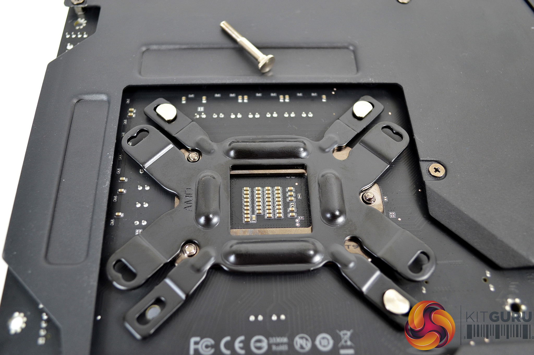Now, prepare the motherboard. Flip it upside down and place the cooler's mounting backplate over the CPU socket's rear retention plate. Notice the three CPU socket retaining screws fit the cut-outs on the SilverStone backplate, and the AMD text on the cooler's mounting backplate is facing up.