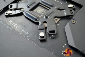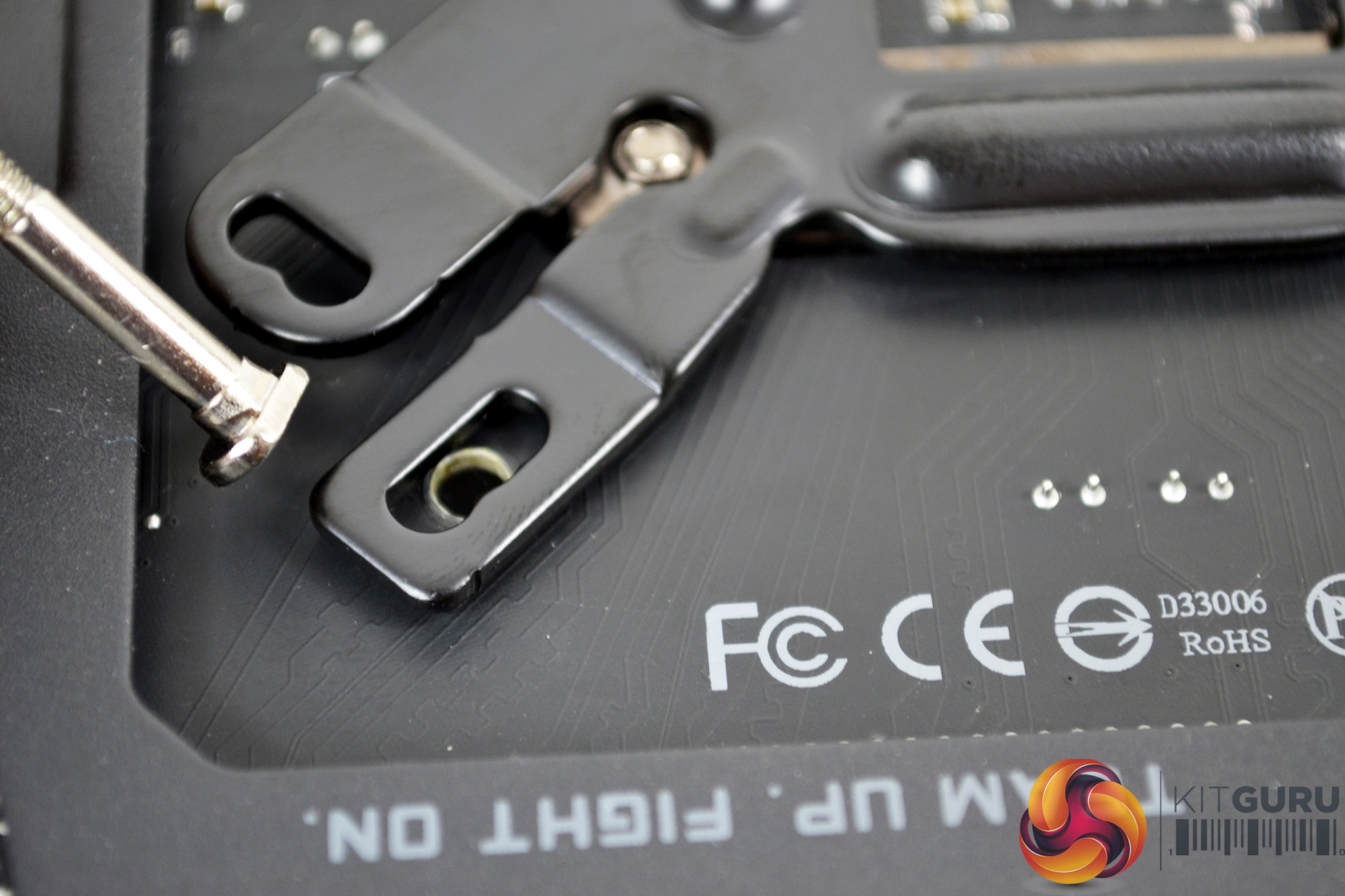 Push the four silver mounting screws into the corresponding holes in the backplate, through the motherboard and in the correct orientation. With nothing to secure the screws when you flip the motherboard back over, we recommend using some tape to hold them temporarily.