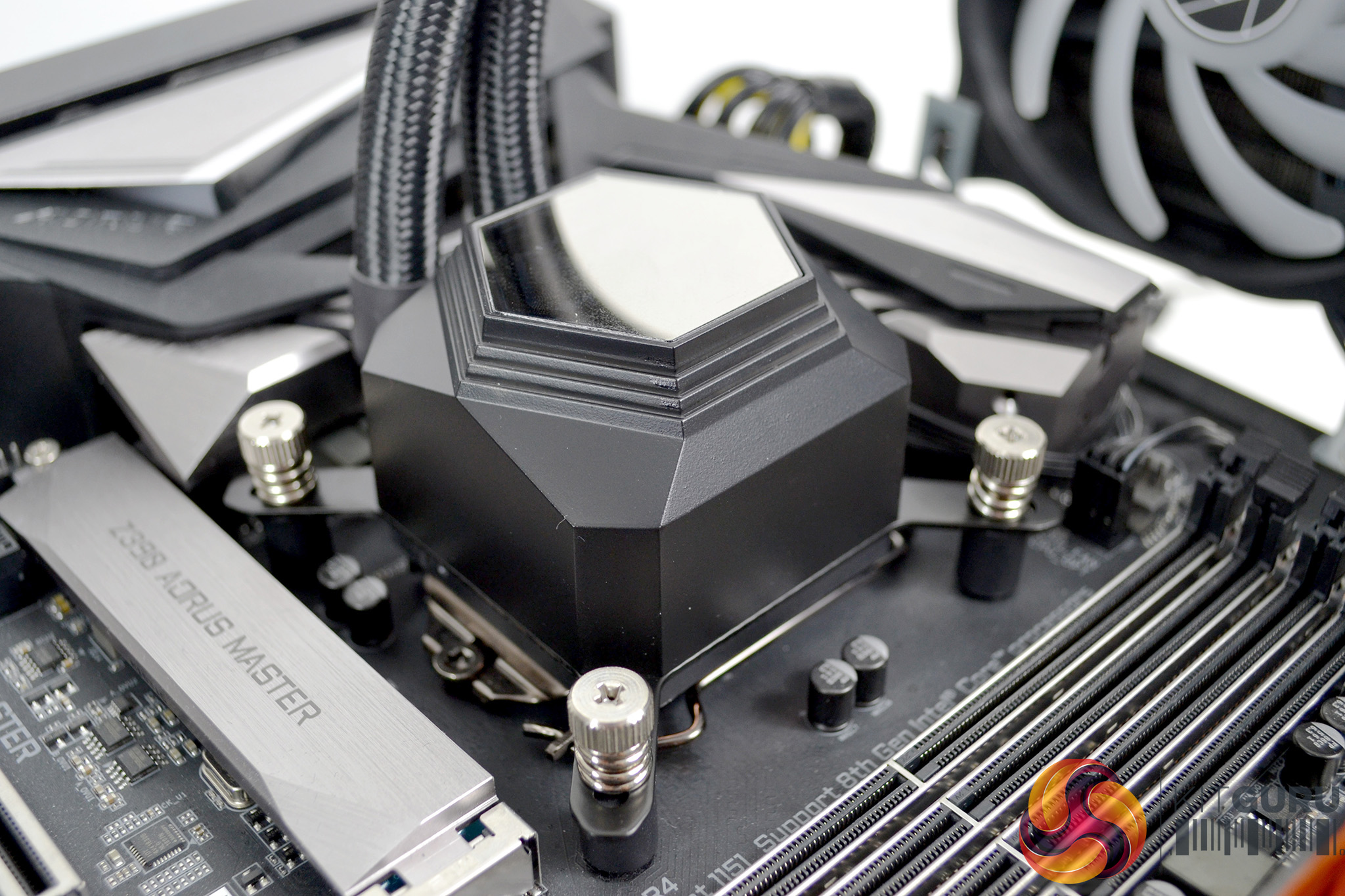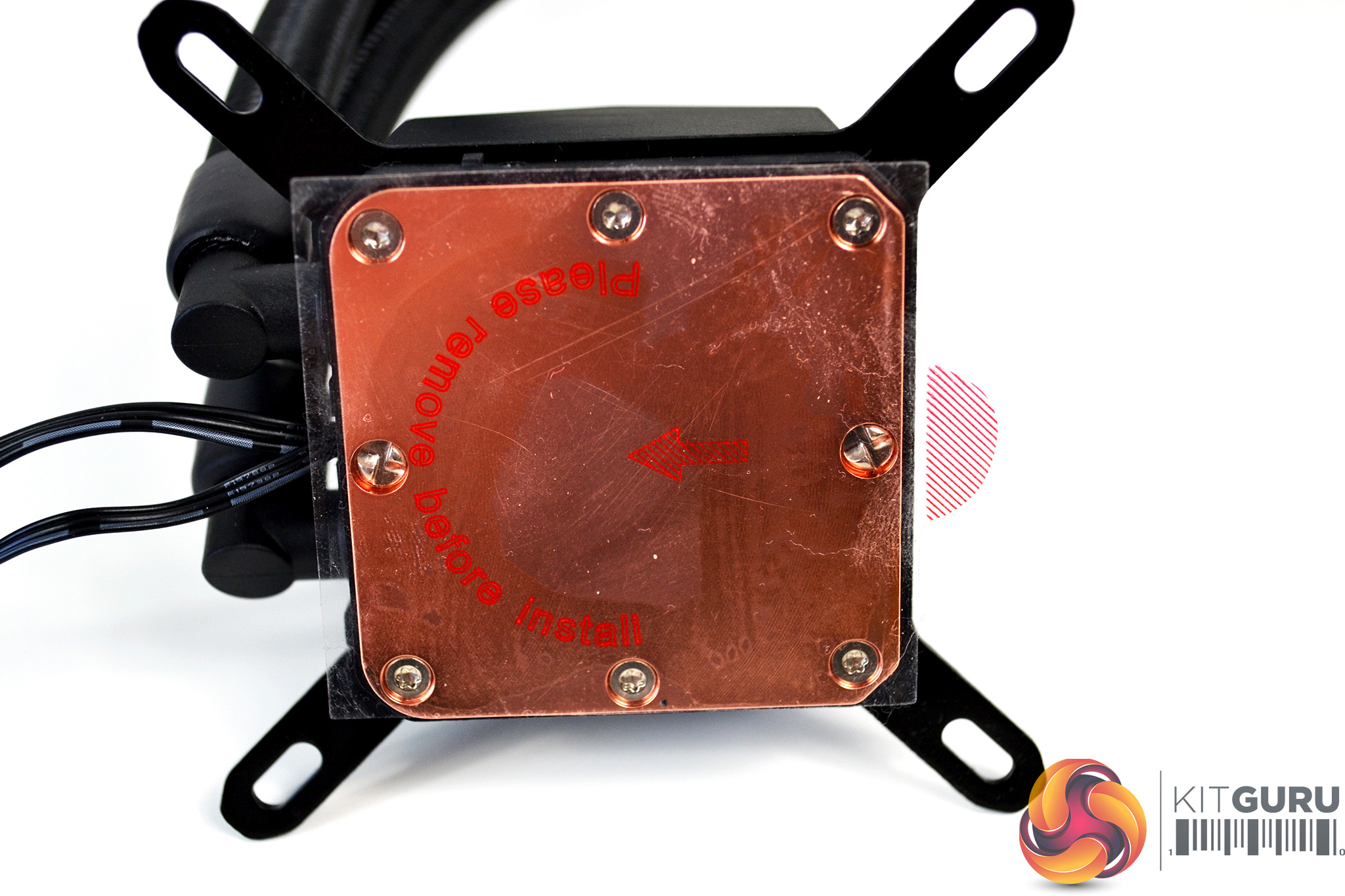 To install the CPU block to the motherboard, remove the protective film from the copper thermal transfer plate, apply thermal compound to the CPU IHS using your chosen method, and lower the CPU block over the mounting screws, aligned with the holes in the bracket. Using the four spring-loaded thumbscrews, tighten down fully in an X pattern to ensure equal pressure is spread over the CPU.