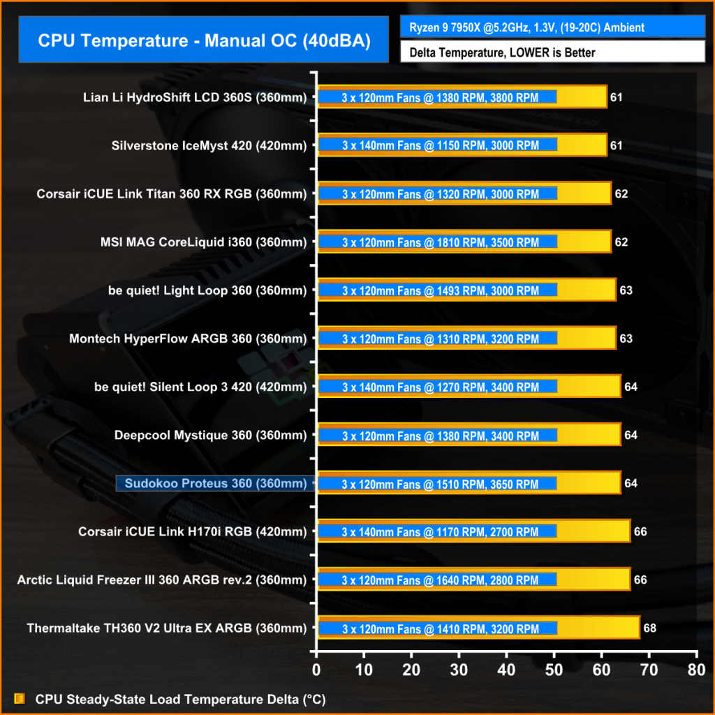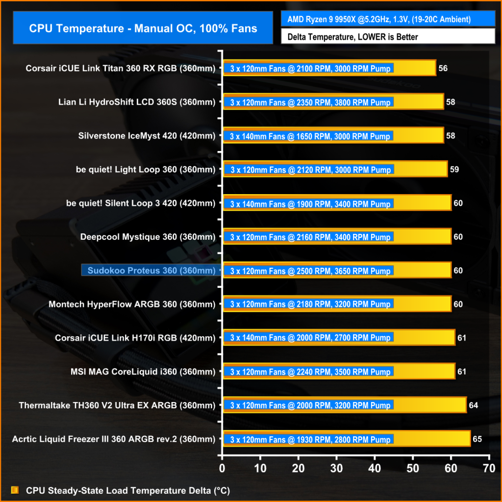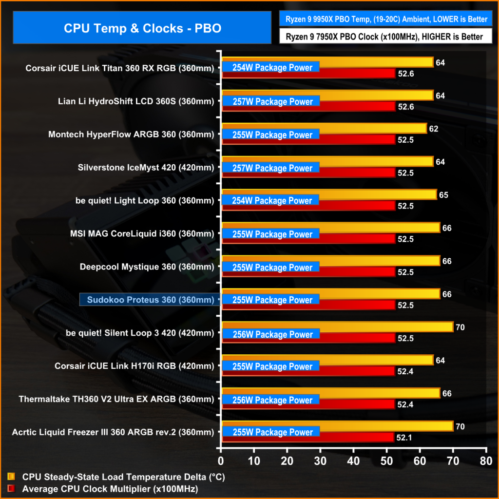 Again, the Sudokoo Proteus 360 performance mirrors the DeepCool Mystique 360 with an average clock multiplier of 52.2 and 66°C over ambient average temperature while cooling 255W CPU package power. This again might look low in the chart but it's only 100MHz off the best, so it's again solid performance but nothing special considering the almost £260 price tag.