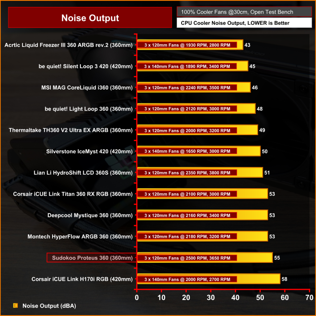 It's no surprise that the Sudokoo Proteus is one of the louder coolers at max fan speed since the 30mm thick fans are running at 2500rpm, which makes it 2dBA louder than the DeepCool Mystique 360 and a huge 12dBA louder than the quietest cooler at max speed, the Arctic Liquid Freezer III.