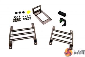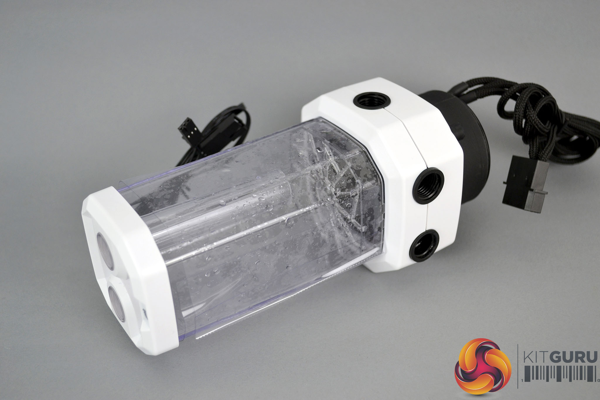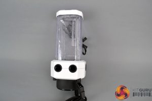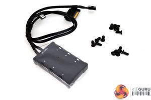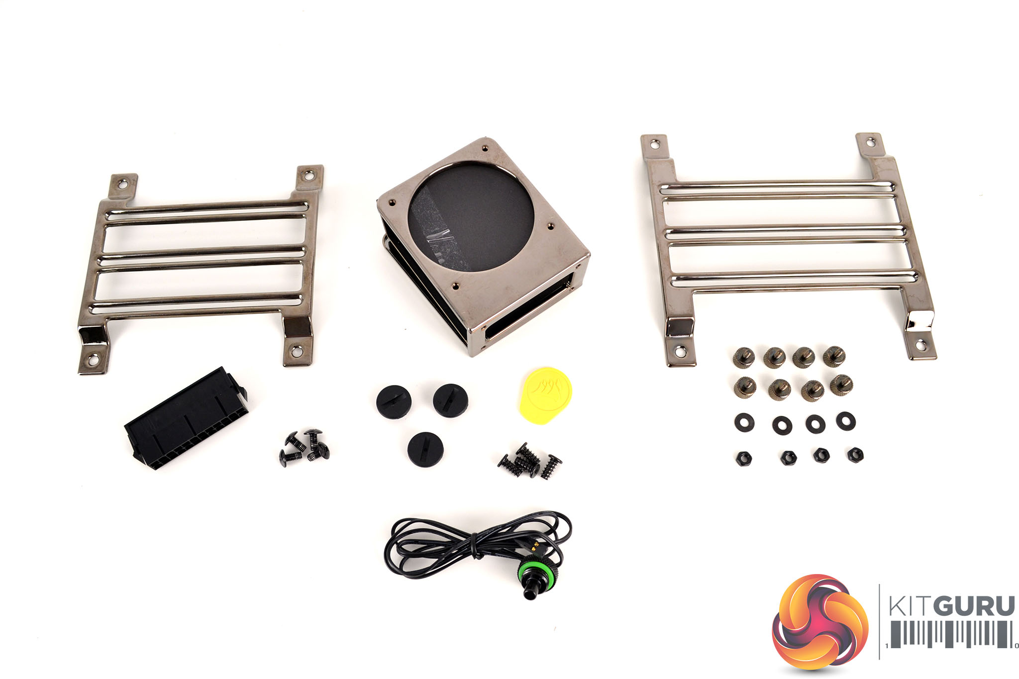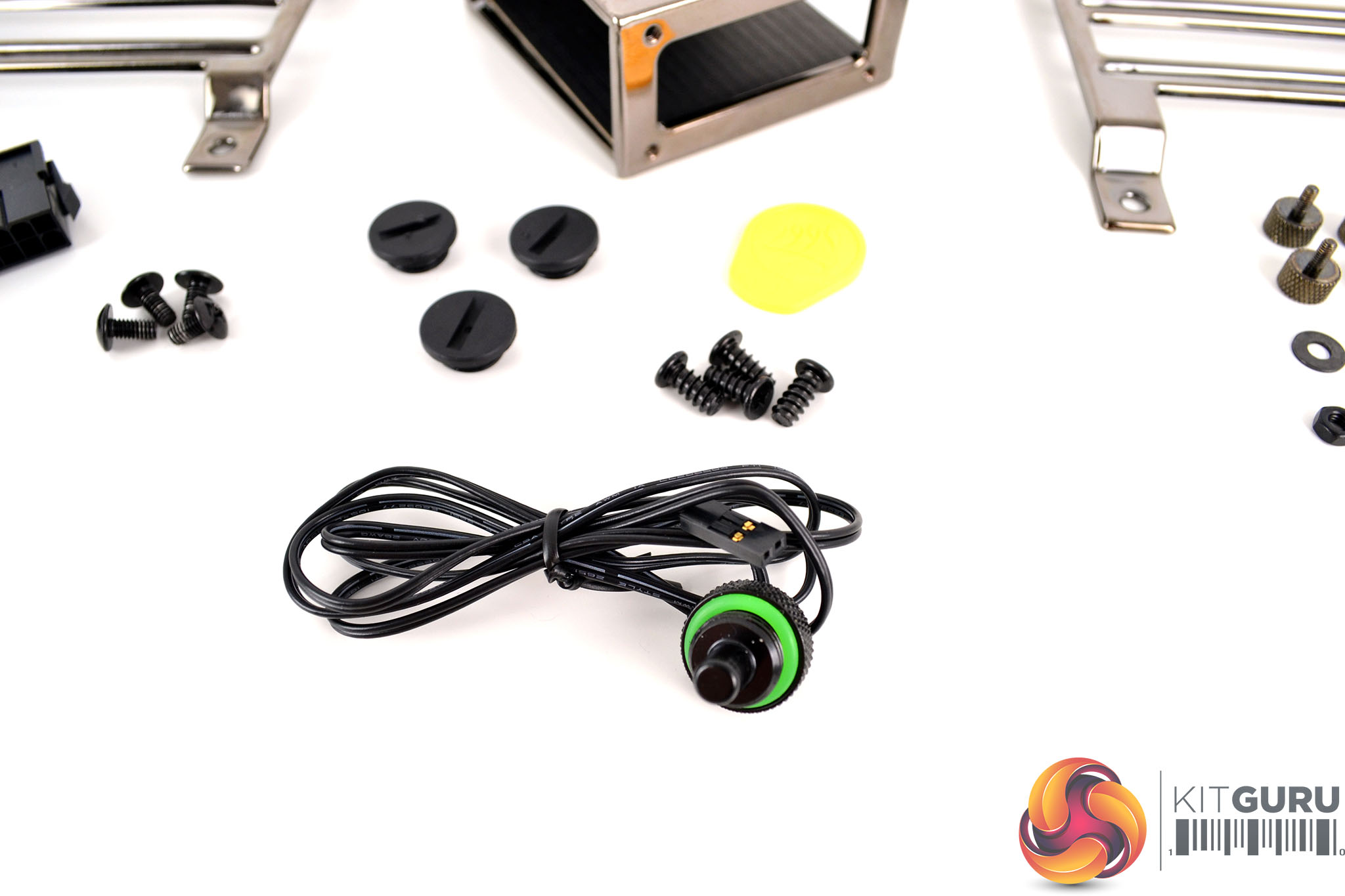 In the box with the XD5 RGB White is a two-piece bracket system for mounting the pump/reservoir on 120/140mm fan locations or on a radiator. There are various screws, washers, nuts and thumbscrews to assemble the bracket, a 24-pin power adaptor to allow the pump to be powered on without powering up the whole system, a few G1/4-inch blanking plugs and a coolant temperature sensor with a G1/4-inch thread.
