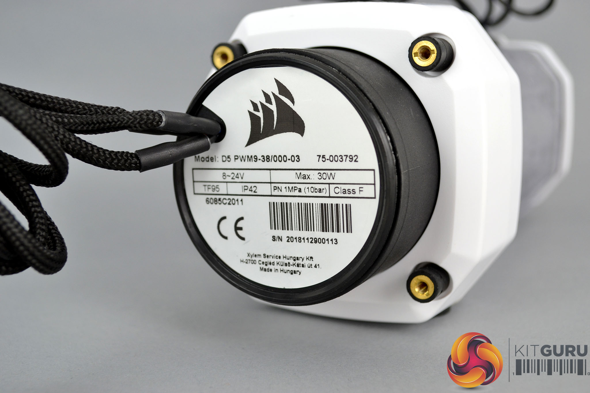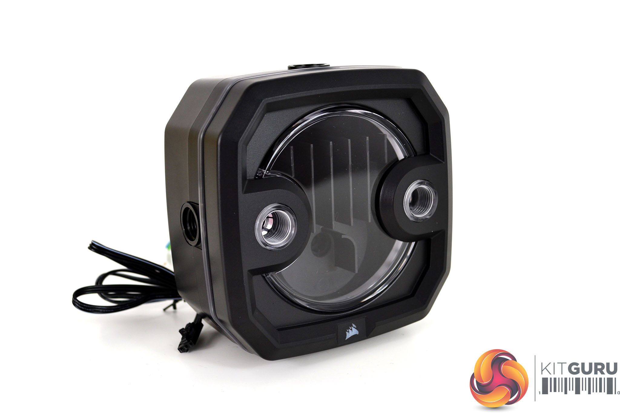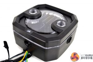 At the rear of the XD3 RGB is a Xylem DDC PWM pump with a speed rating of 4800RPM and a maximum flow rate of 380L/h at 2.1m pressure head, as well as a Molex power cable, 4-pin PWM speed control cable, a Corsair proprietary RGB cable/RGB daisy chain cable and rubberised mountings with brass inserts.