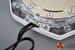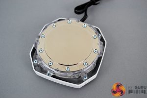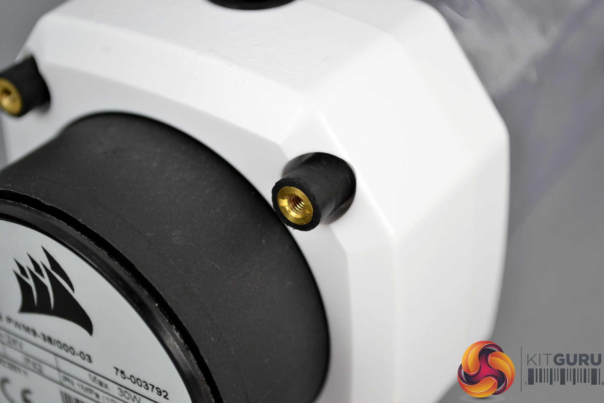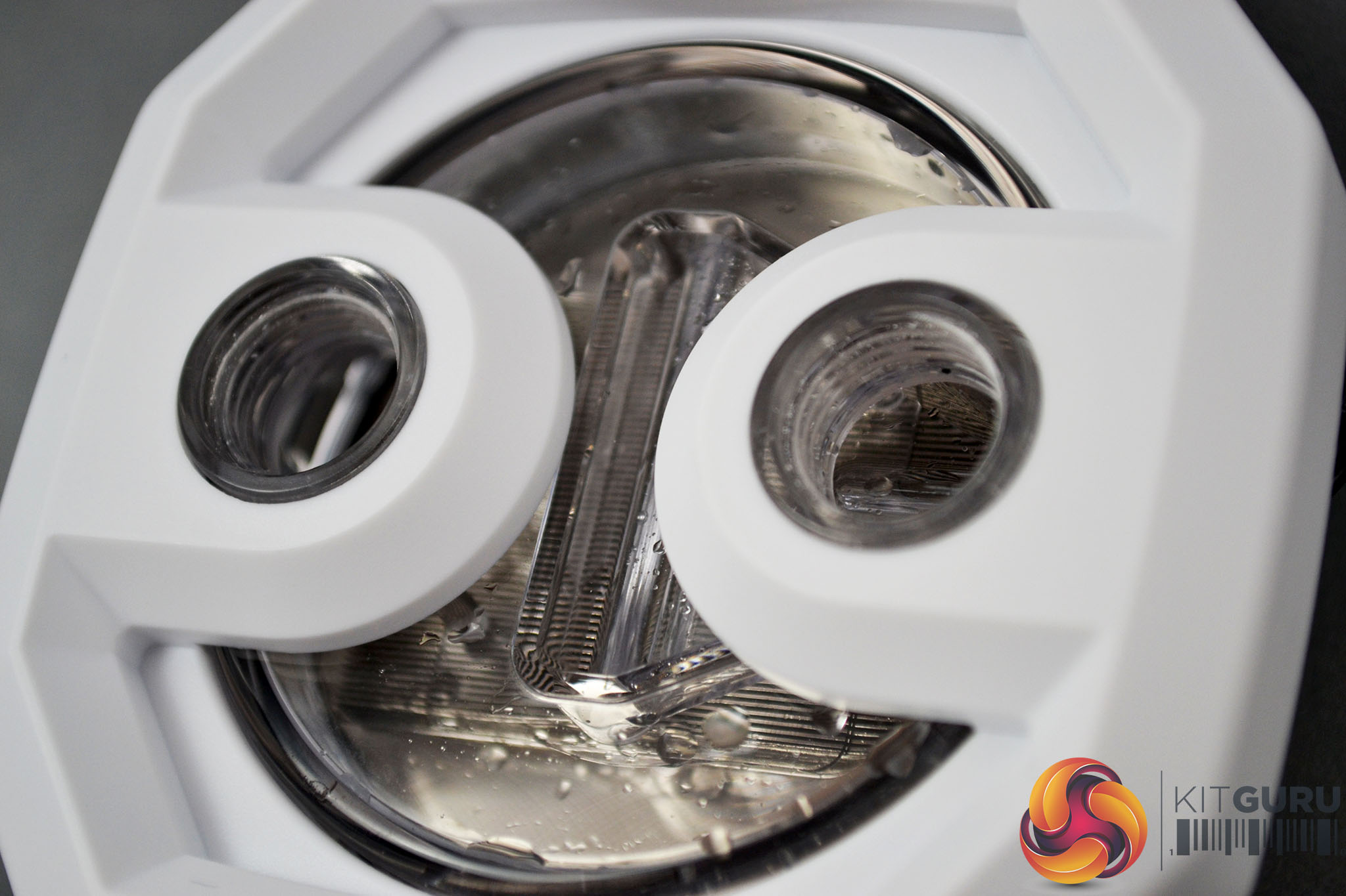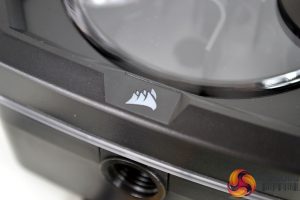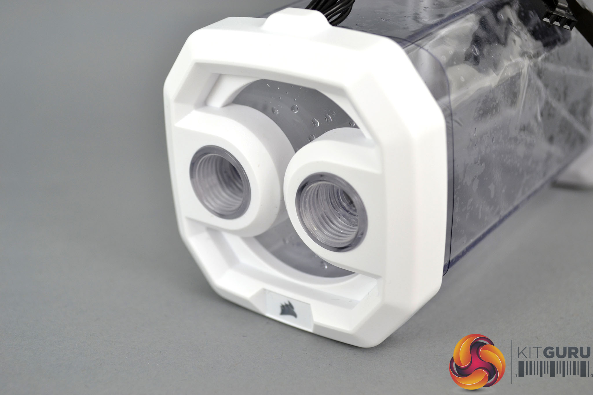 At the top of the XC7 CPU block is where the only change from the original is noticeable. A white plastic top cover with a Corsair logo replaces the black of the original, there is a transparent water chamber illuminated with RGB lighting and standard G1/4-inch fittings are used for the water inlet and outlet ports.