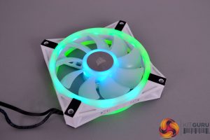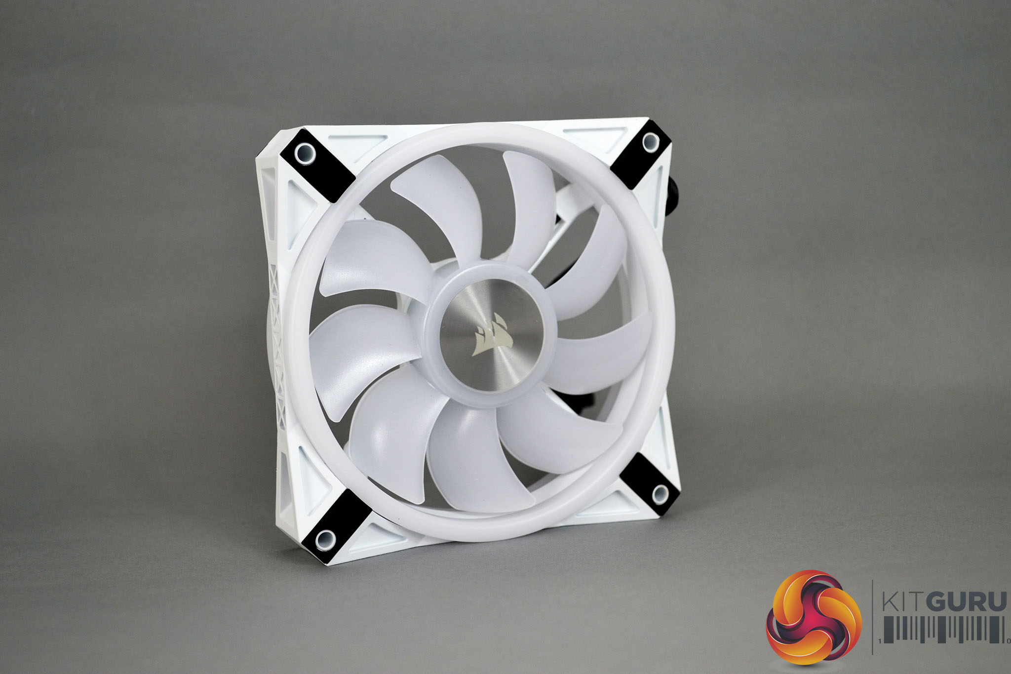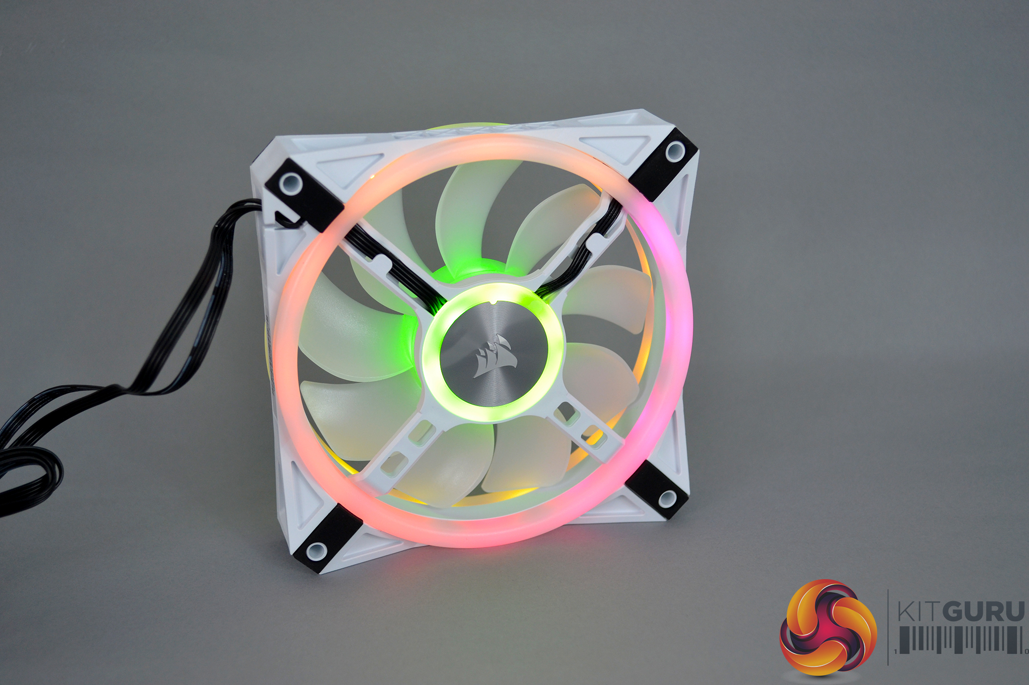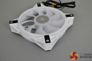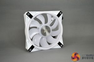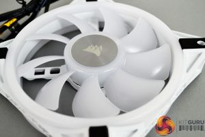 The QL fan frame is white with black anti-vibration rubber on all four corners, an outer ring and the nine fans blades are manufactured from an opaque white plastic which is illuminated with RGB lighting. The central fan hub is equipped with a Corsair logo on a silver background.