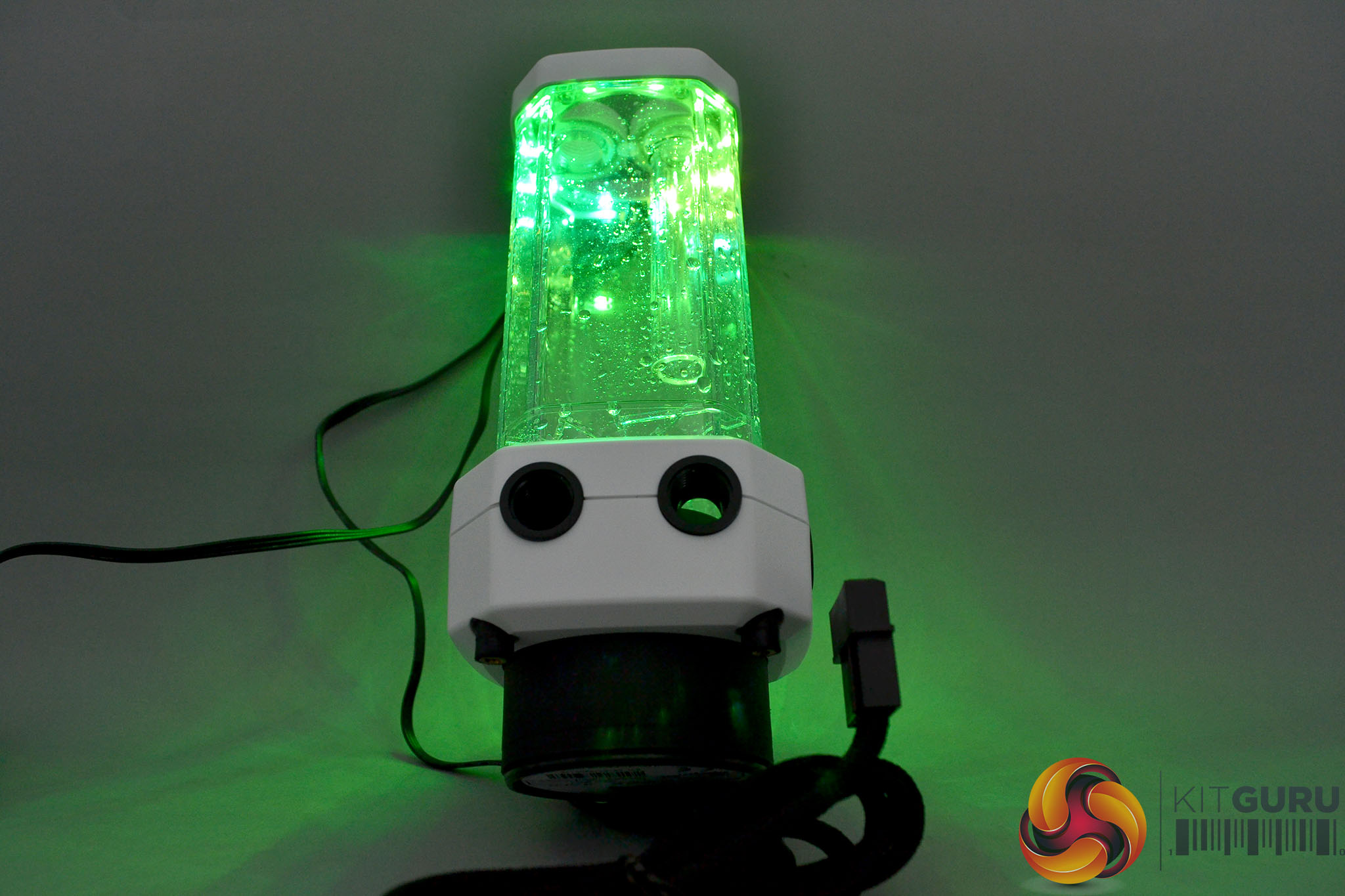 The reservoir of the XD5 RGB White is manufactured from acrylic material and holds a maximum water capacity of 330ml. The integrated D5 pump has a maximum speed of 4800RPM, a flow rate of 800L/h at 2.1m pressure head and power is provided via Molex connector with an additional 4-pin fan connector for PWM speed control..