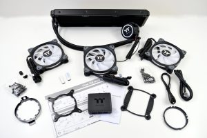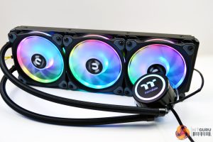 Looking at the CPU block/pump, it seems to be accurately machined and manufactured from high quality copper. The pump, which is rated at 12V 3600RPM, is contained in a black plastic housing, which has an RGB ring around the perimeter and the Thermaltake logo in the centre is also a RGB zone. Thermaltake state that “Combined with a copper base plate and a reliable pump, the Floe DX series provides high performance and unparalleled heat dissipation”. After carrying out our tests, we will find out how good the performance actually is.