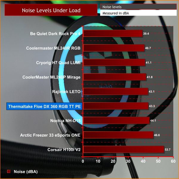 As you can see in the chart, the Floe DX 360 is by no means the quietest cooler we have tested. The Dark Rock Pro 4 still maintains its lead at the top. But considering the Floe DX is the only cooler in our chart with three 120mm fans, the noise levels are actually admirable at 100% speed. While the system was idle in windows and the fan speed lowered, it was barely audible.
