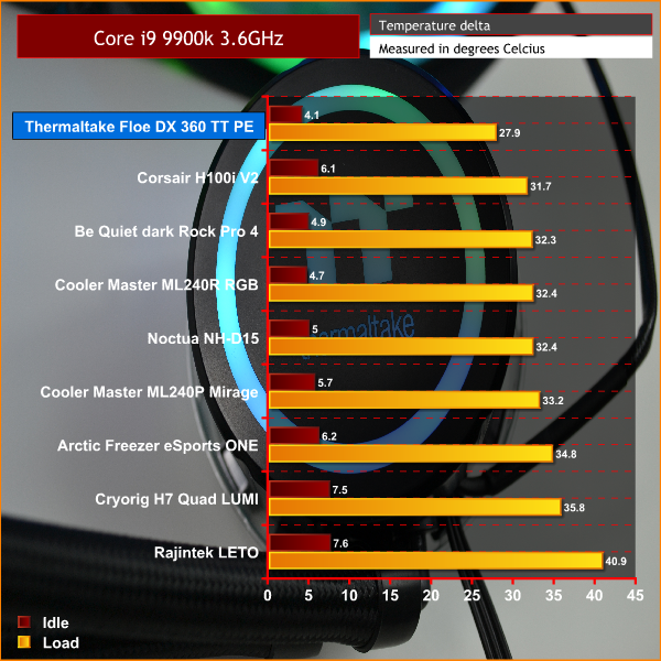 At the stock 3.6GHz frequency, it is a very convincing start to the tests from the Floe DX. It jumps right to the top of our charts both at idle and under load, beating the Corsair H100i V2 by just under 4ºC under load, which is pretty impressive. At idle, it is just 0.6°C below the 2nd place Cooler Master.