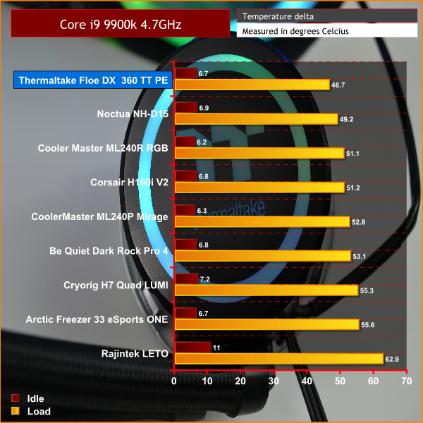It is a similar story in our initial overclocking test. With CPU frequency set at 4.7GHz and a Vcore of 1.20v, we see the Floe DX 360 out in front by just 2.5°C versus the Noctua NH-D15. This is quite an impressive achievement, as the Noctua has been regarded, by many, as the best cooler for raw performance for some time.