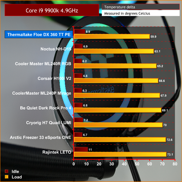 With the CPU set at our highest overclocked frequency of 4.9GHz and Vcore at 1.30v, we see the Floe DX 360 pull out an even bigger lead over the Noctua NH-D15, beating it by 3.2°C and over 5°C cooler than Cooler Master ML240R. Great results!