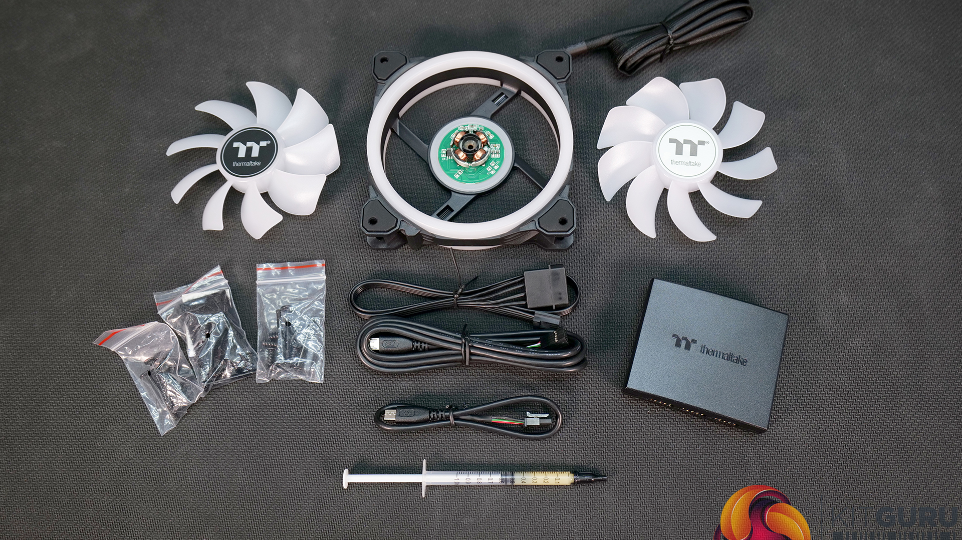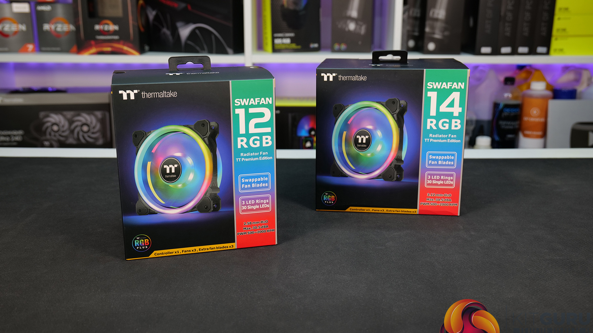 SWAFANs are available in 120mm and 140mm versions supplied currently in three packs with two sets of fan blades, a Thermaltake RGB controller, various fan screws and a tube of bearing lube for the price of £89.00 here in the UK. That might sound expensive but when you compare it to Corsair QL fans which currently cost £99 and only come with one fan blade and similar RGB lighting effects, the price of the Thermaltake SWAFAN sounds reasonable.