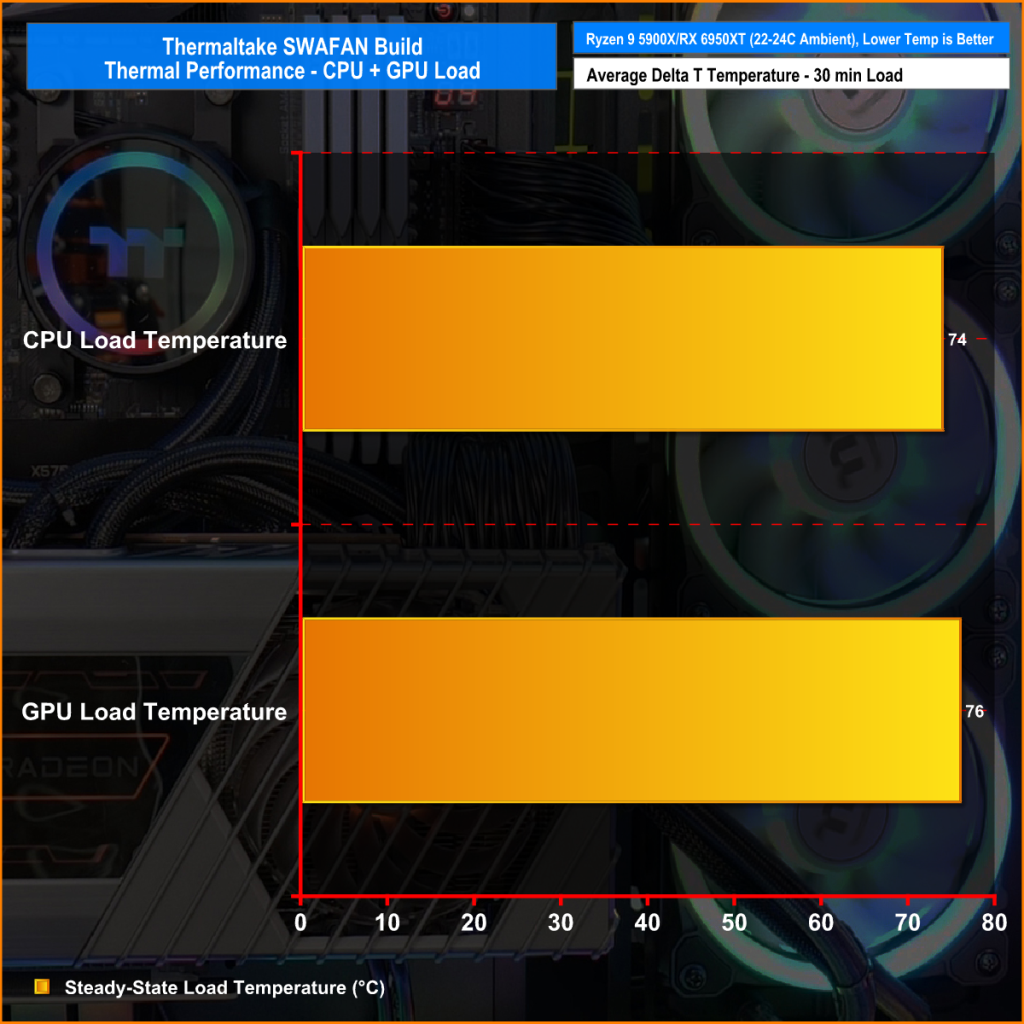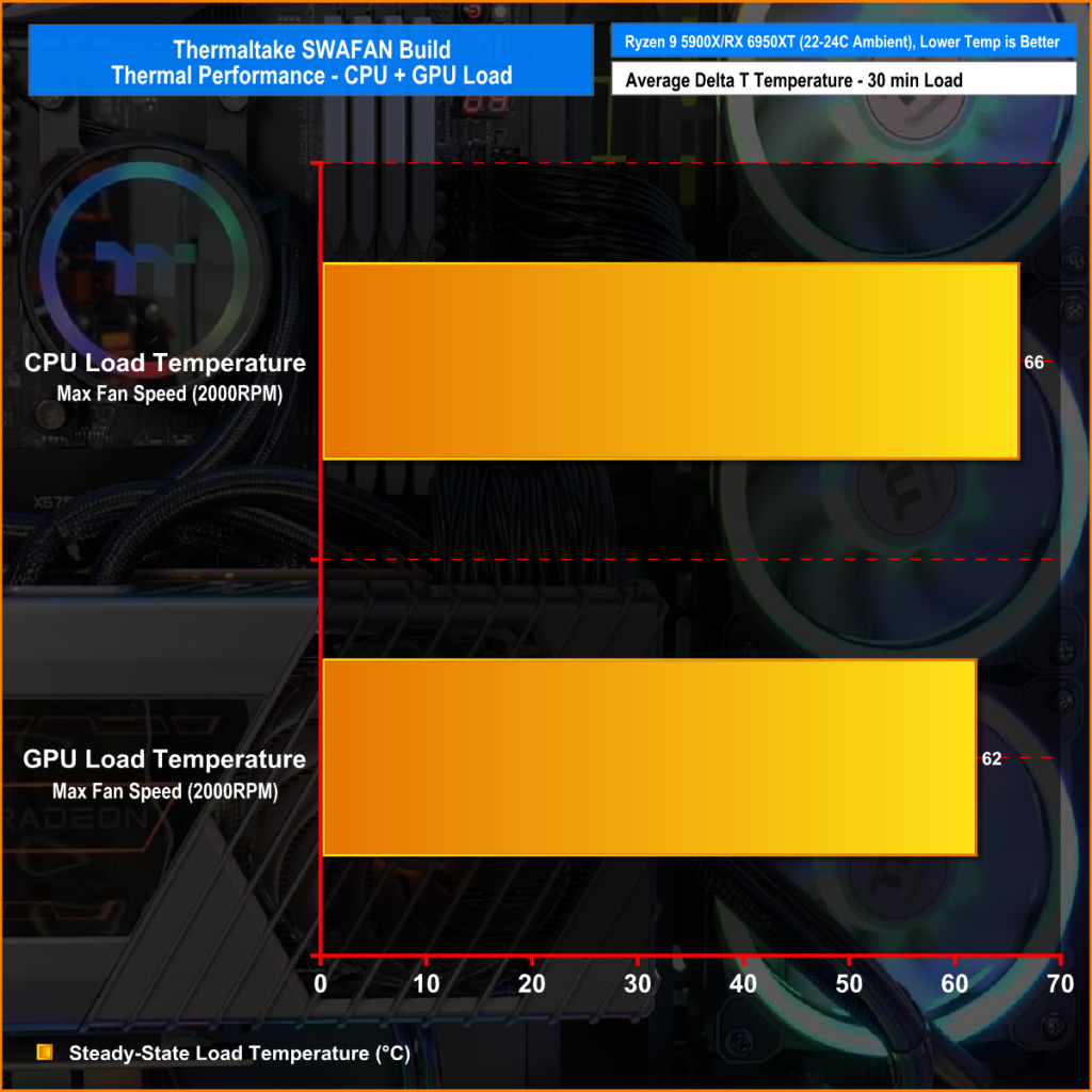 Since this is not a full review of the Thermaltake SWAFAN, we didn’t go into much detail with the thermal testing but we wouldn’t like to say they are good or bad fans without even testing system temperature at all. So we ran a series of quick thermal tests, fully loading the system for 30 minutes by running the 3DMark Time Spy Extreme and Cinebench R23 Stress tests simultaneously while recording the peak steady-state temperature of the CPU and GPU while measuring the system noise level.