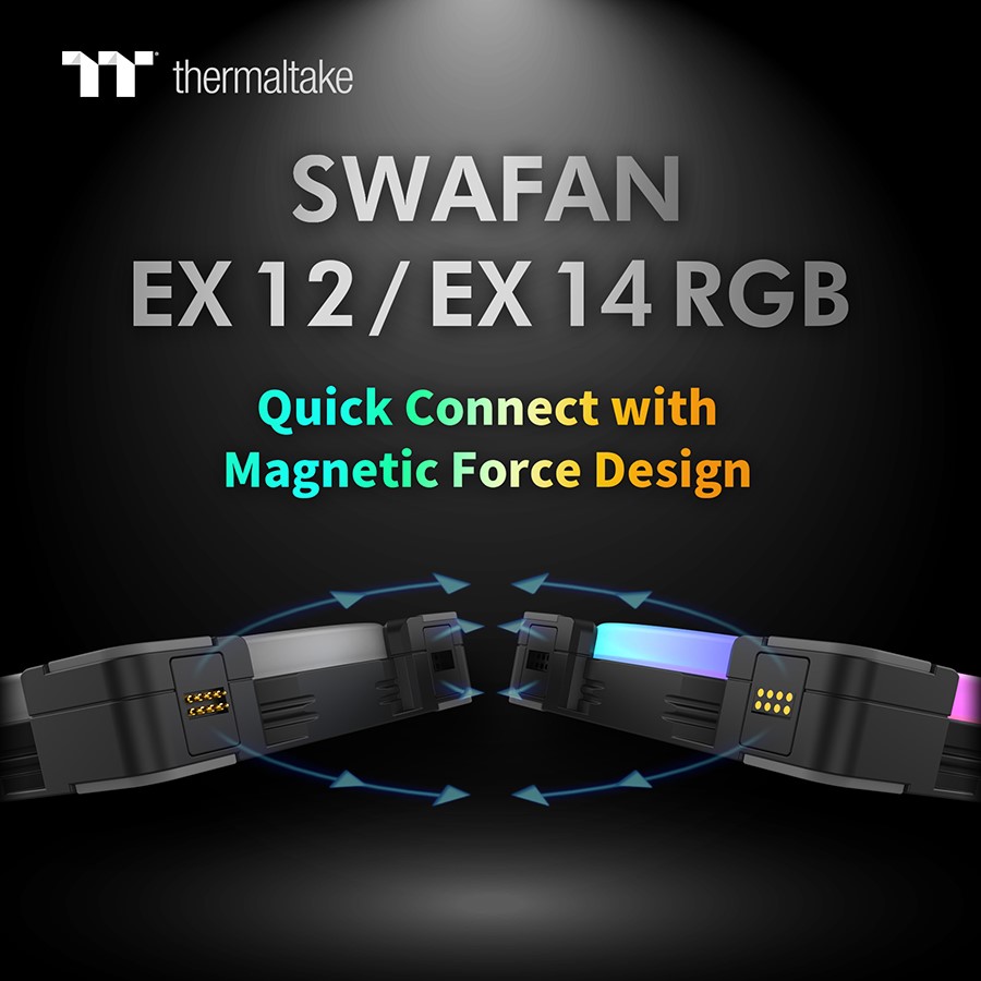 Available in 120mm and 140mm sizes, the Swafan EX RGB series was designed to reduce clutter for easier cable management. Thanks to the Magnetic Force design employed on the fan's power cable and frame, you can daisy chain up to three fans with a single 12V cable and attach them effortlessly using the magnets.