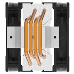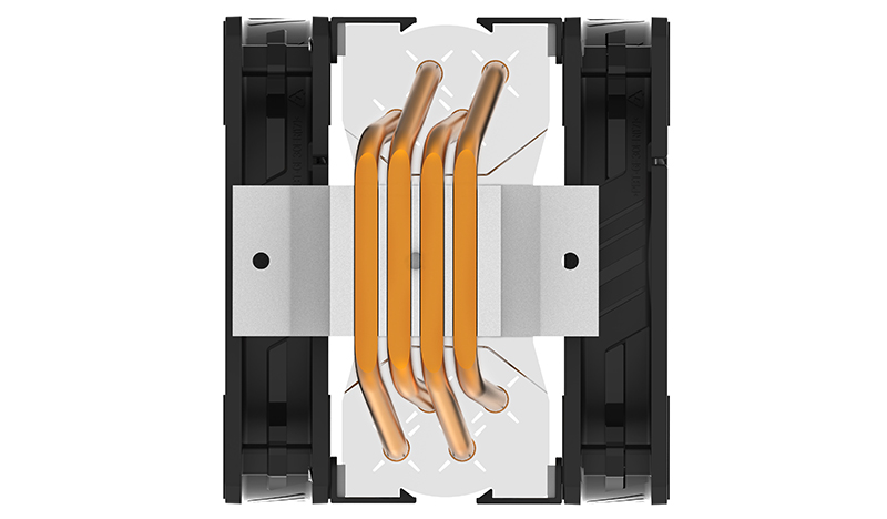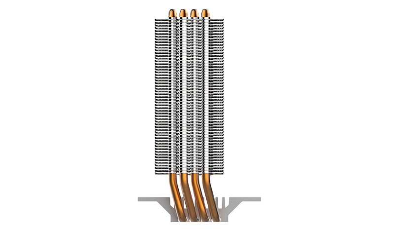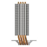 The fans spin between 650-1,800RPM (±10%), generating up to 61CFM of air volume and up to 27dBA of noise. The fans' rated MTBF is 160000 hours and connect to the motherboard through a 4-pin (PWM) connector. Using direct touch technology, the 4 asymmetrical heat pipes transfer the heat from the plate to the aluminium heatsink, which is then cooled by the two fans.