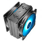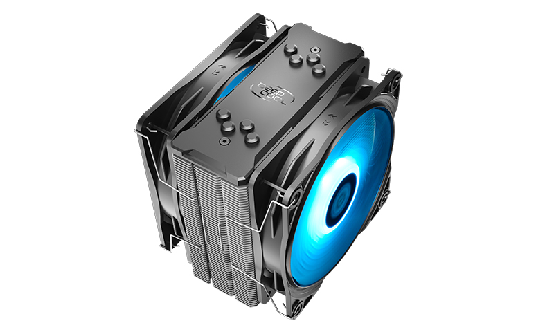The 2x 120mm PWM fans use blue LEDs to improve aesthetics and hydro-bearing. Deepcool states these fans can generate up to 64.5 CFM of airflow thanks to the fan speed ranging between 500~1650±10% RPM, and have an air pressure of 2.1mmAq. The rated maximum noise level of these fans is below 27.8 dBA
