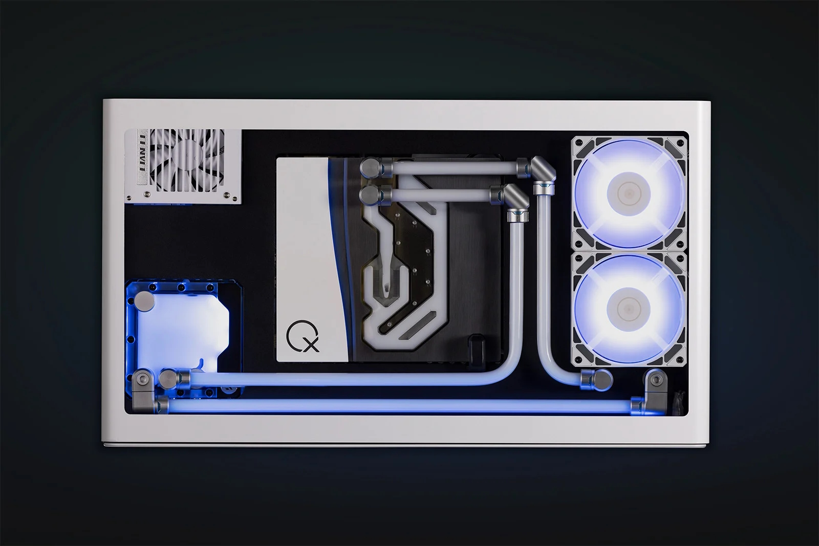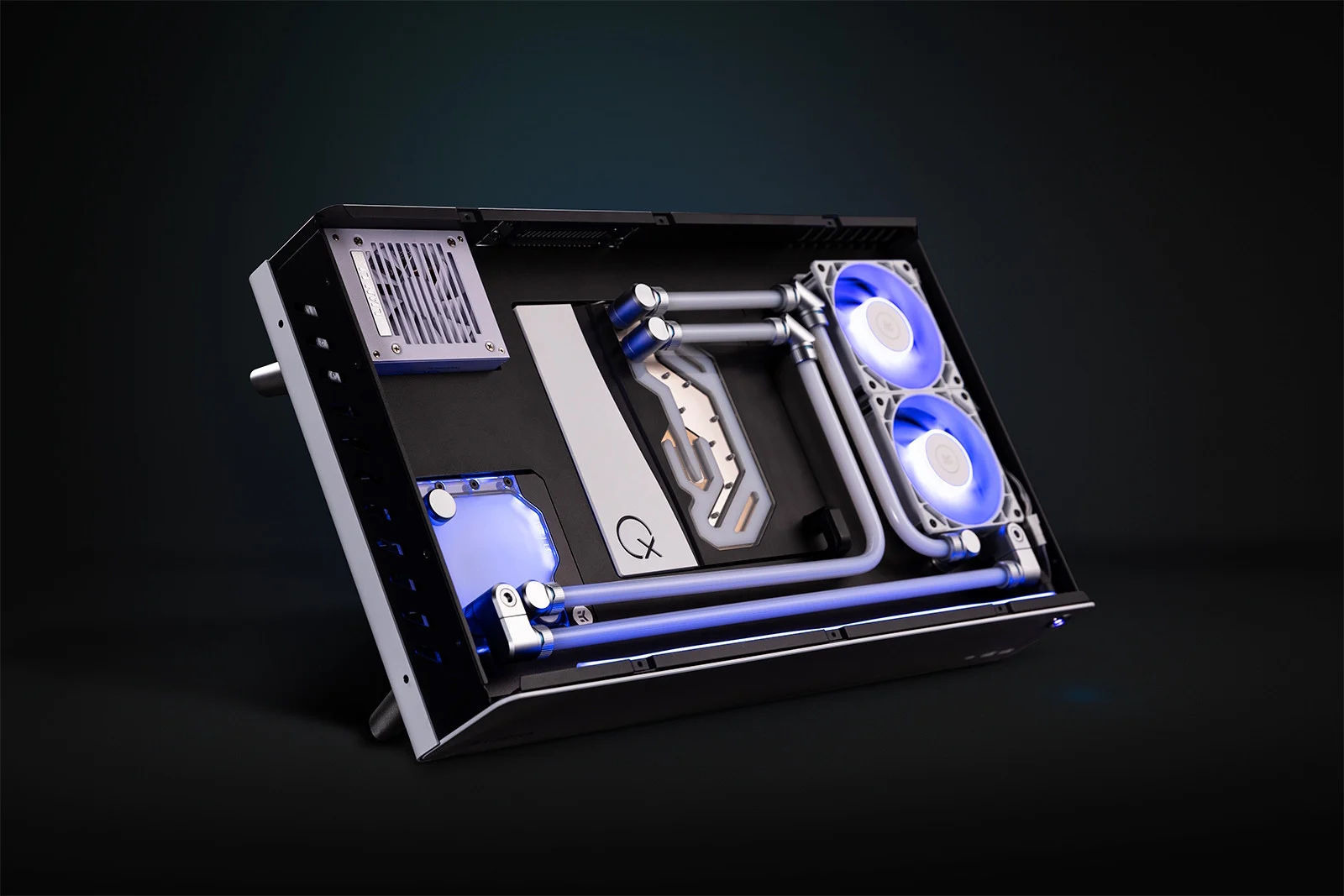 By encasing it in this monoblock, the console's footprint is reduced, allowing it to fit within mATX PC cases. The monoblock base is made of nickel-plated electrolytic copper and has a see-through glass window like many other water-cooling blocks. Additional aesthetic and assembly elements are constructed of stainless steel and aluminium and are not in contact with the coolant, preventing metal mixing. Moreover, the addressable D-RGB LED strip has 24 individually addressable LEDs that run along the Plexi window.