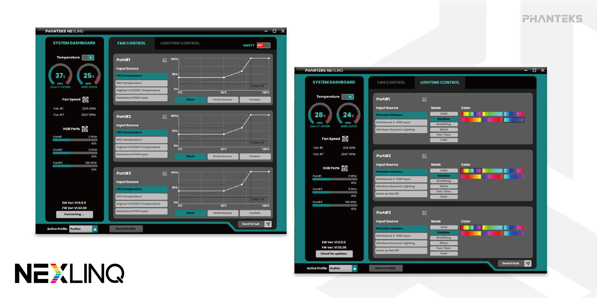 At the heart of Nexlinq is the Nexlinq Hub, which uses the new Linq 6 connector to simplify connections and reduce cable management hurdles. The accompanying Nexlinq App provides an intuitive interface for controlling fan speeds and RGB lighting effects across your entire system.