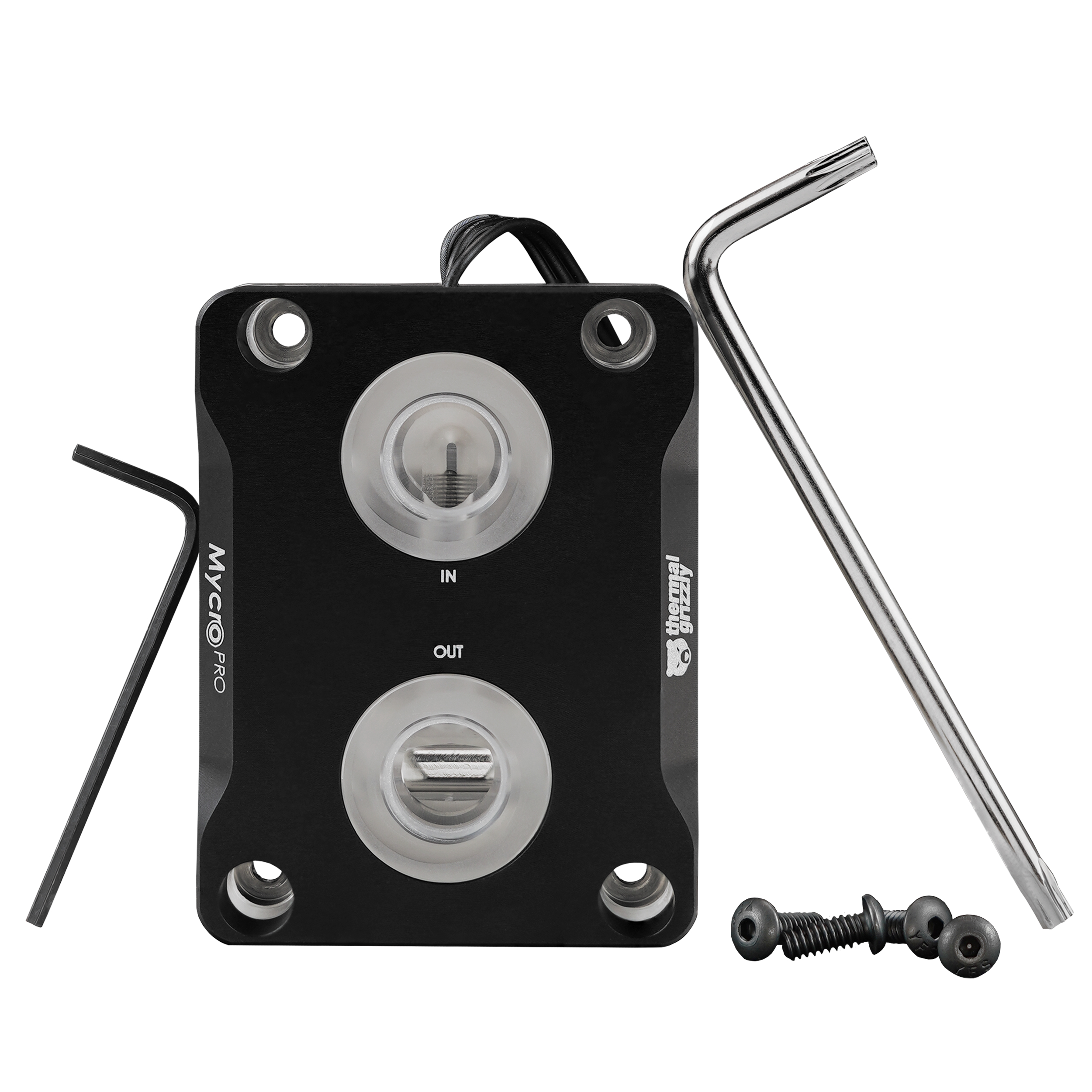 The Intel Mycro Direct-Die Pro RGB V1 is designed to be coupled with liquid metal between the CPU die and the block's plate. To prevent gallium-based liquid metal from diffusing into the copper, the copper cooler is nickel-plated. Moreover, the block features an anodised aluminium lid and customisable RGB LED lighting (3-pin ARGB header) beneath the tempered acrylic glass. The custom water cooling circuit is connected through an I/O with G1/4-inch threading.