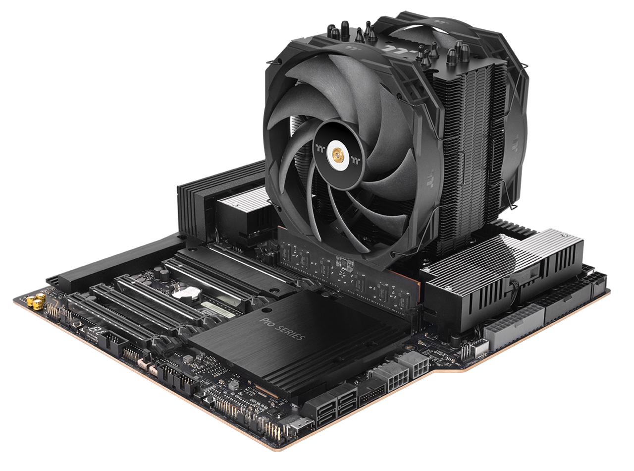 Brought to our attention by ITHome (via TechPowerUp), Thermaltake's new cooler measures 143.2 x 115 x 165mm and features a single-tower heatsink with aluminium fins. It is compatible with Intel LGA4677 and AMD sTR5/SP6 sockets and is rated to provide a cooling capacity of up to 500W TDP. The heatsink has six 6mm diameter copper heat pipes connected to a nickel-plated copper base. High-quality solder paste is used at the interfaces between the heat pipes and the heatsink fins and between the heat pipes and the copper base to optimise thermal conductivity.