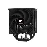 The CNPS13X Black CPU air cooler has a standard aluminium fin-stack tower heatsink skewed slightly to the left to avoid fan encroachment into the motherboard's memory region. A nickel-plated copper base contacts the CPU, through which five 6mm copper heat pipes flow, transferring heat to the heatsink ventilated by a 120mm Zalman AF120 fan. The cooler's base has a reverse direct-touch heat pipe design, which lowers the gap between the heat source and the heat pipes to improve conductivity.