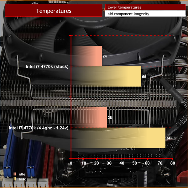 So the weak link here is the internal packaging of the Core i7, rather than the cooler that you actually mount on your motherboard. This means that while the 150W and 220W TDP figures may well be accurate they are essentially meaningless. We dropped core voltage manually to 1.24v and the cooler coped with the load much better (see graph above). Some 4770k processors will not run stable at 4.4ghz with only 1.24v however.