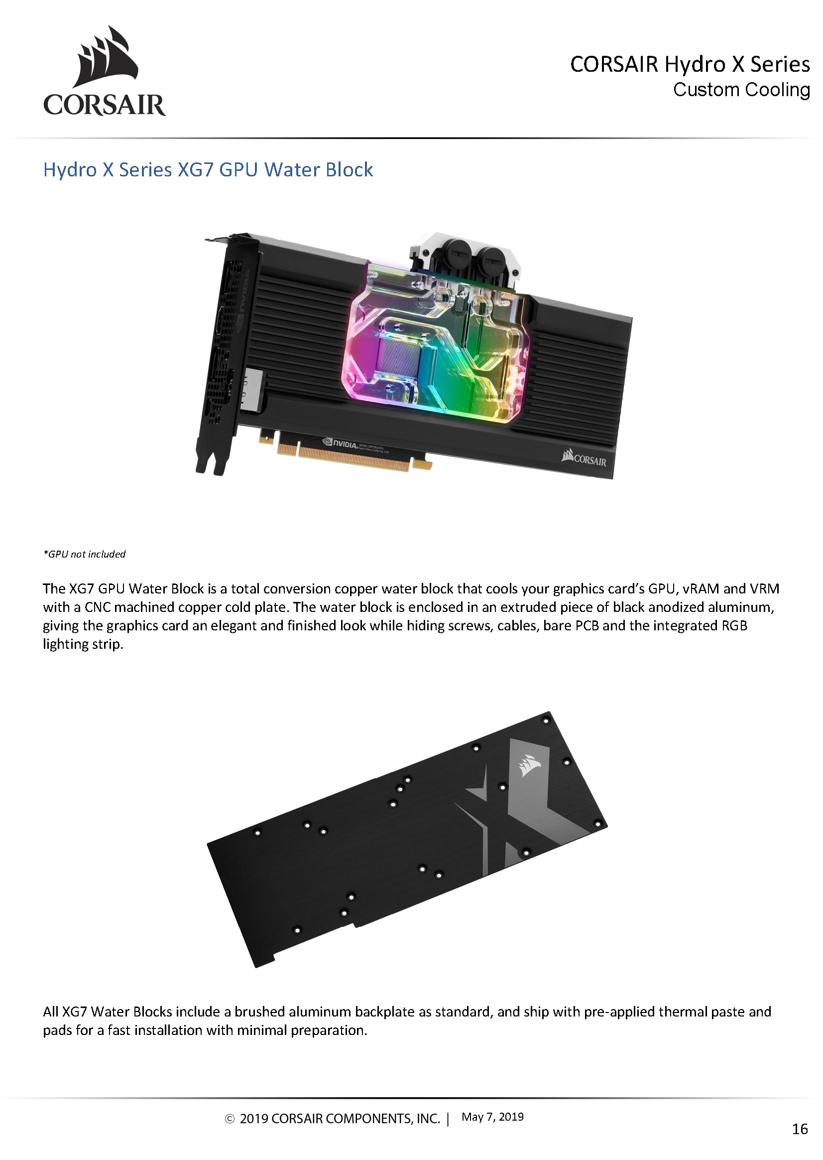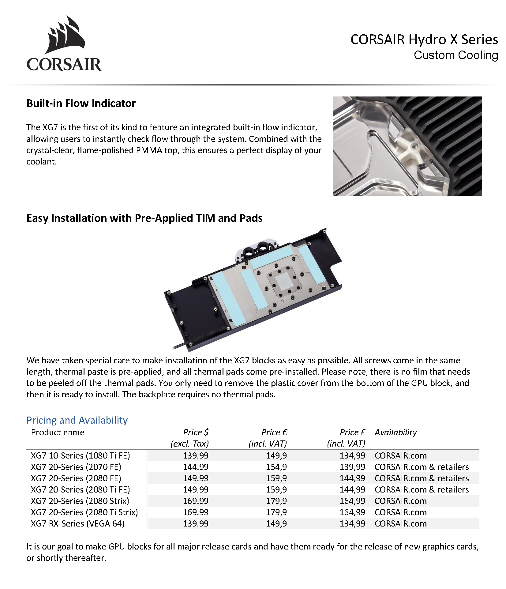 Blocks are available for GTX 10-series, RTX 20-series, 2080/2080 Ti Strix and Vega 64 with prices ranging from £135 to £165. Each block is manufactured by CNC machining which means it is quick and easy to make, and the design can be easily adapted to allow Corsair to manufacture variants for after-market graphics cards. As you can see in our video there is a chamber in the block that hides away the RGB hardware and cables.