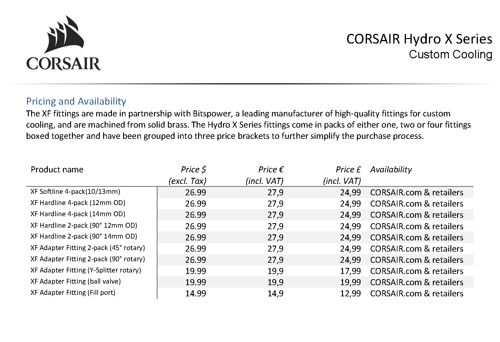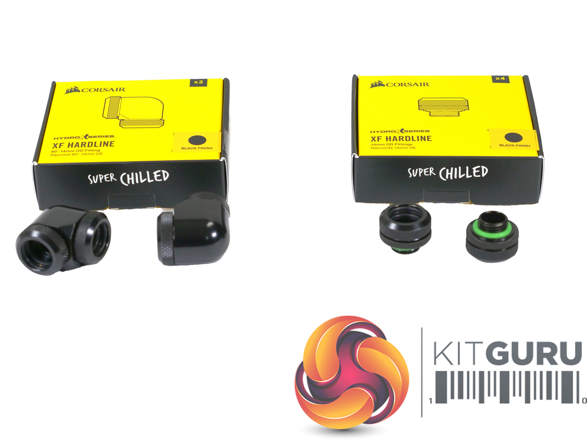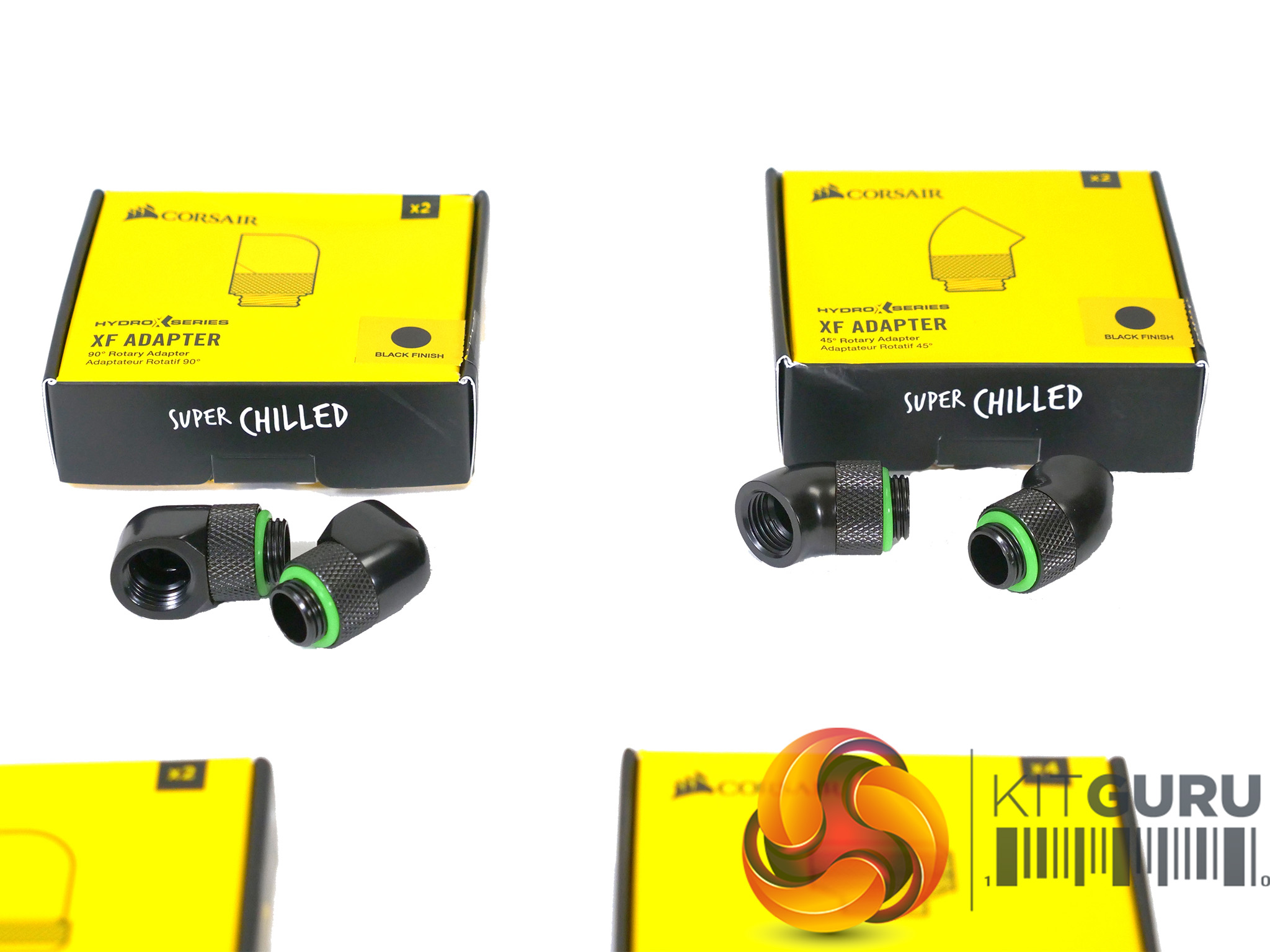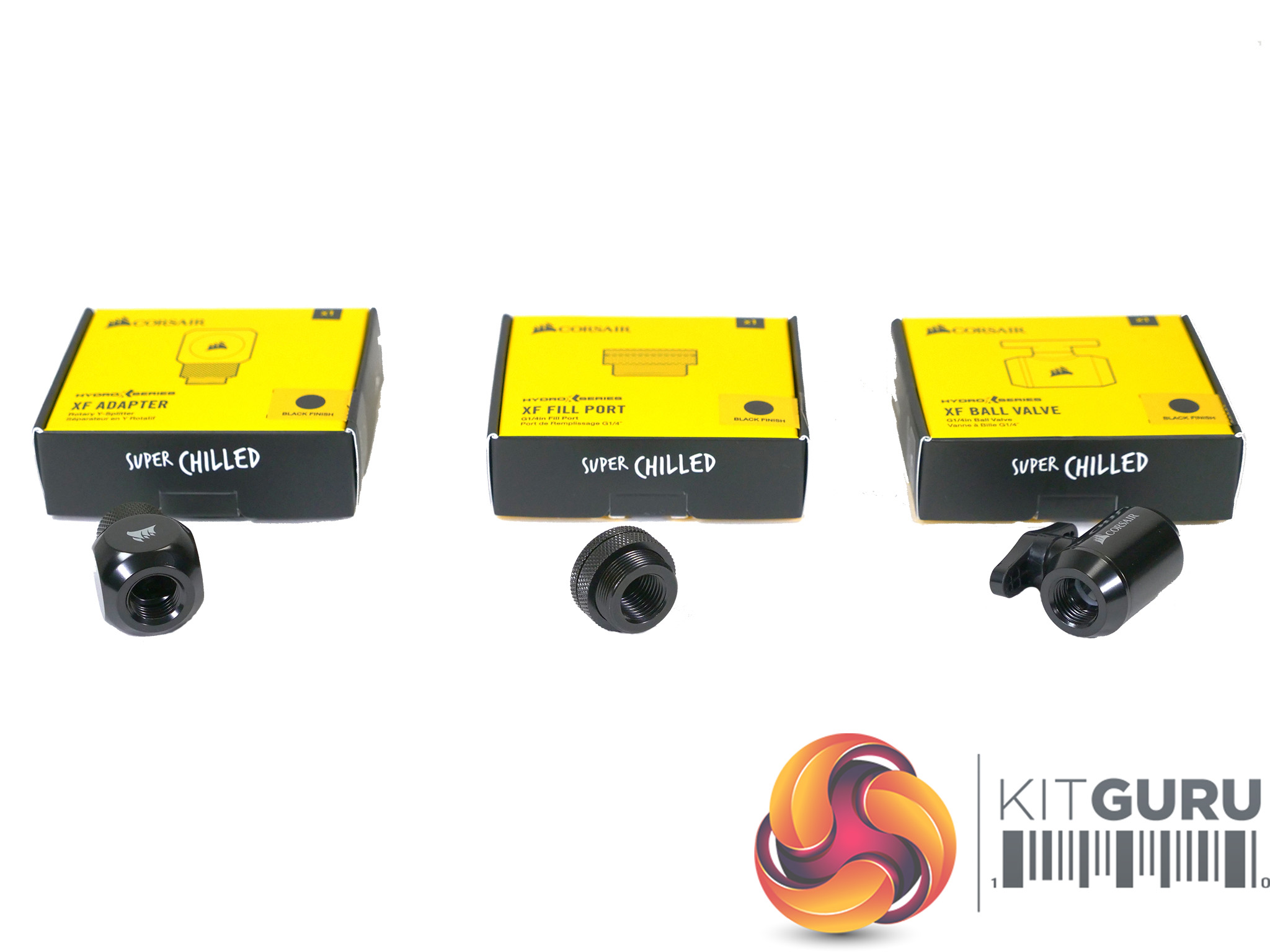XF Series brass fittings by Bitspower are available in three types; 10/13mm soft line, 12mm OD hard line and 14mm OD hard line in white, grey, gold and black. Add in speciality fittings (45 degree, 90 degree, Y splitter, fill port and ball valve) and you have quite a few permutations to play with, although it is clear Corsair could increase the size of the product range without difficulty.