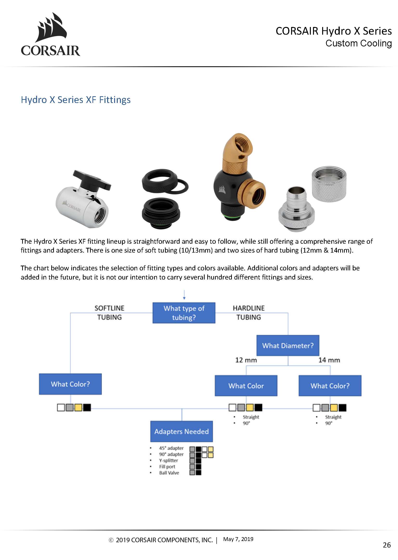 XT Tubing comes in three sizes to match the fittings. The is a single size of soft line PVC tubing which is 10/13mm, and two sizes of acrylic hard line tubing (10/12mm and 10/14mm). Corsair is using acrylic and has chosen to avoid PETG.