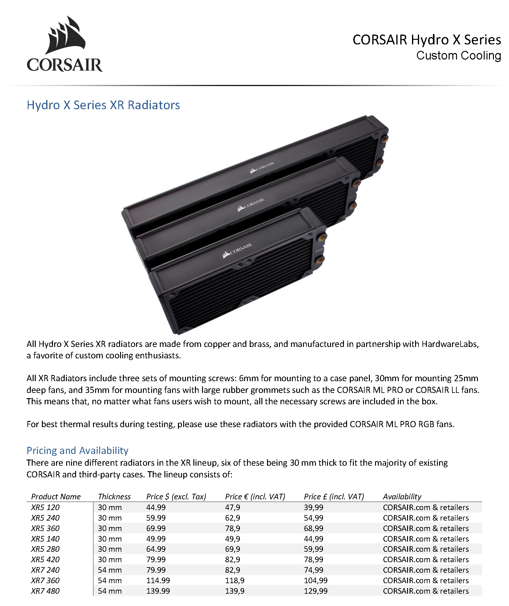 Radiators by Hardware Labs fall into two groups. The XR5 models are 30mm thick while XR7 are 54mm thick. That thicker size sounds unusual, however it is well established in Hardware Labs’ Nemesis GTR and GTX models. Both 120mm and 140mm units are available with sizes ranging from 120mm/140mm to 480mm/420mm which should keep most people happy. Prices start at £40 and top out at £130 which looks absolutely fine.