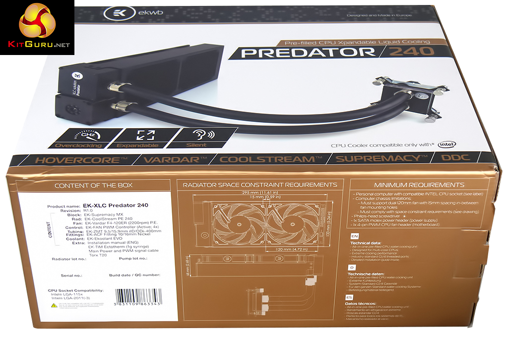 When you look at the EK Predator 240 you will see a beefy 38mm thick copper radiator, a pair of Vardar fans, the large diameter flexible tubing and that lovely translucent CPU water block. Predator is visually impressive but what EKWB is really selling here is convenience as the system arrives fully assembled and also offers you the ability to upgrade your cooling system in the future.