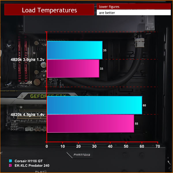 While the EKWB Predator is consistently a few degrees cooler than the Corsair H110i GT it is pretty insignificant in the great scheme of things. To put it another way, we were gratified to see the EKWB Predator cooler perform well as we expected nothing less however we were also impressed by the efficacy of the much cheaper Corsair system.