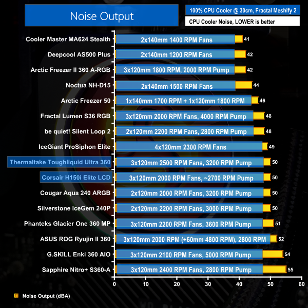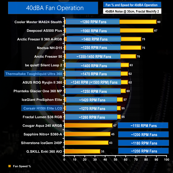 Thermaltake’s Toughliquid Ultra 360 faired well in this test, with its fans managing to run at 62% duty cycle for 40dBA noise output. This translated into around 1470 RPM operating speed according to the UEFI and monitoring software. We also maintained pump speed at 100% or 3200 RPM for Thermaltake.