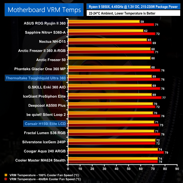 And rounding out with VRM temperature data, Thermaltake does better here and that is primarily due to its higher speed fans in the vicinity of our motherboard’s VRM heatsink. Corsair’s incidental VRM cooling results are uninspiring at full speed, but are comparably mediocre for the 40dBA comparison.