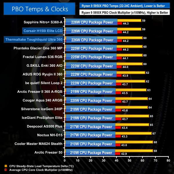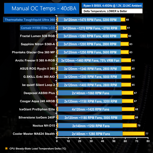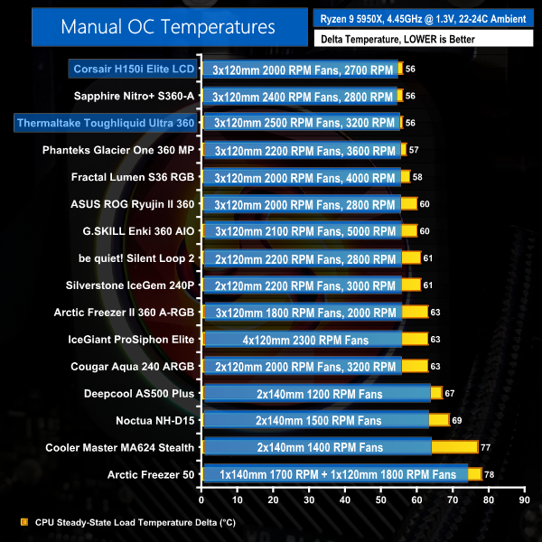 Both the Corsair and Thermaltake 360 AIOs manage to match the Asetek-based Sapphire cooler that we recently reviewed for top spot in our chart. Handling around 220W of Ryzen 9 5950X package power for a sub-60C delta reading is impressive.
