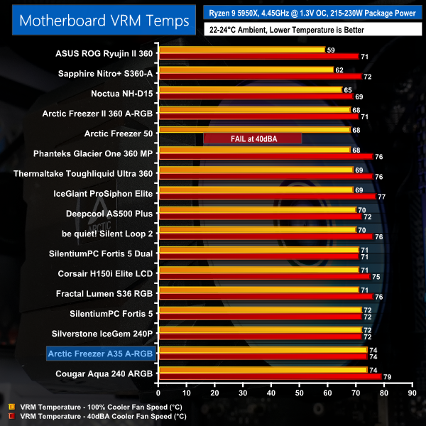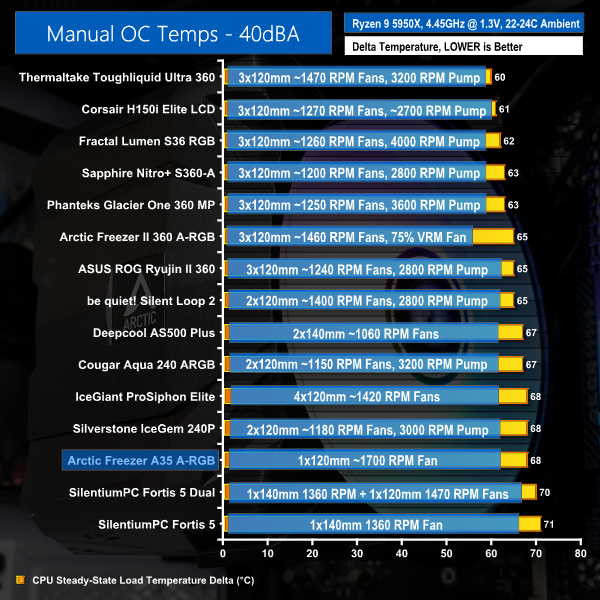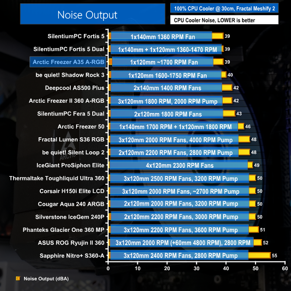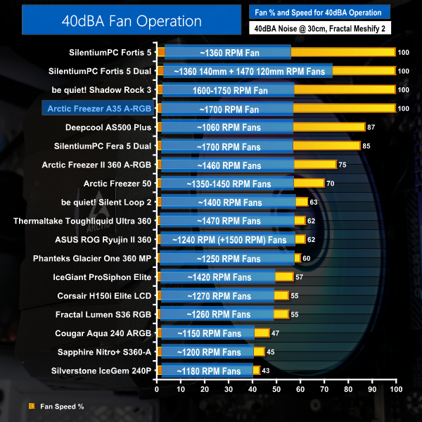 Arctic still holds a lead over SilentiumPC, but there really isn’t much of a performance degradation on the Freezer A35 A-RGB versus some 40 dBA-locked mid-range AIO or air coolers.