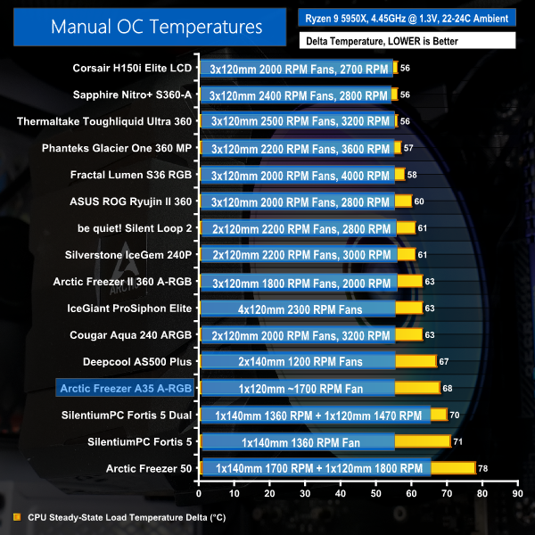Arctic’s Freezer A35 A-RGB offers stellar cooling performance in our overclocked test situation. That’s even when pitted against a bunch of expensive or high-end liquid coolers as reference points.