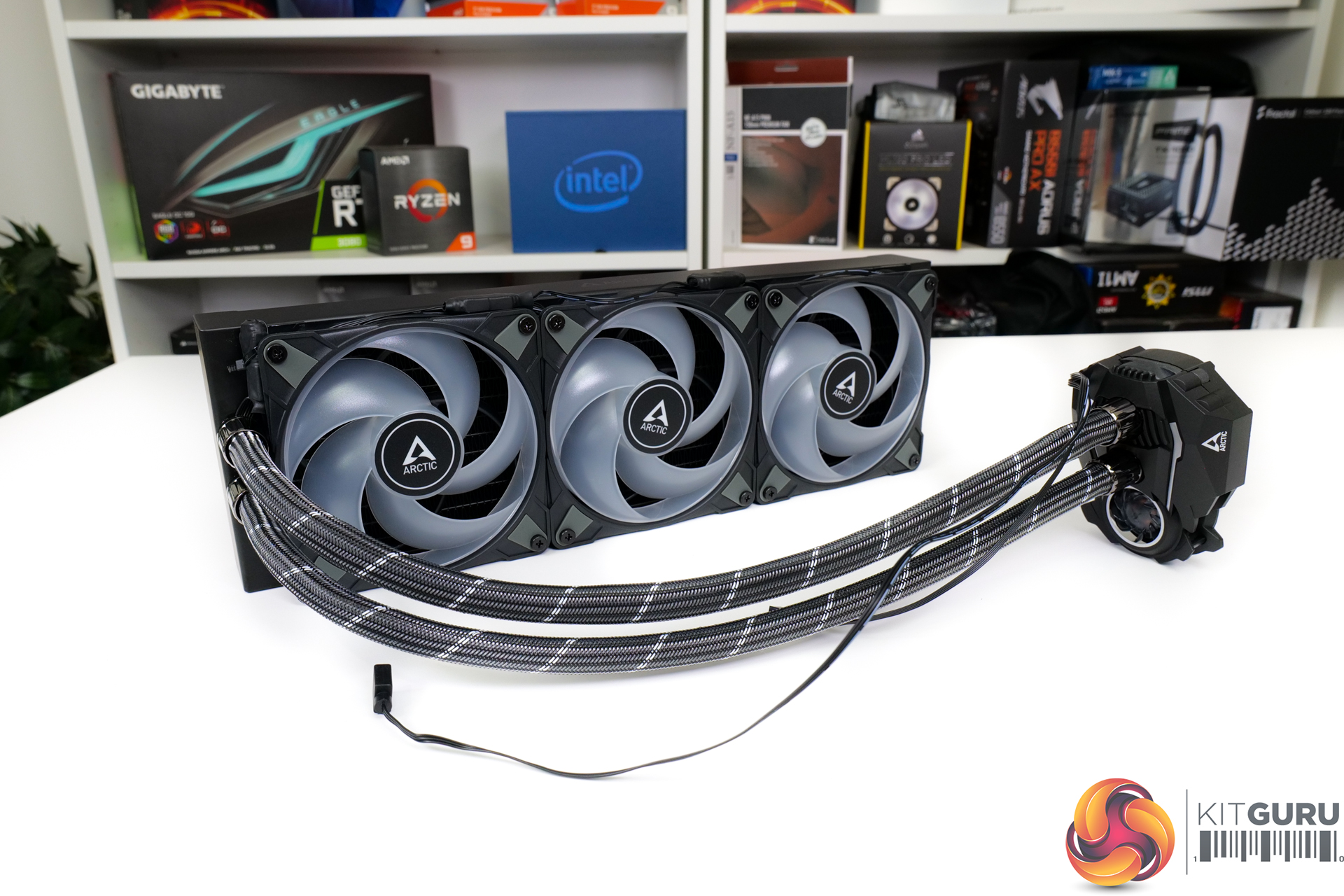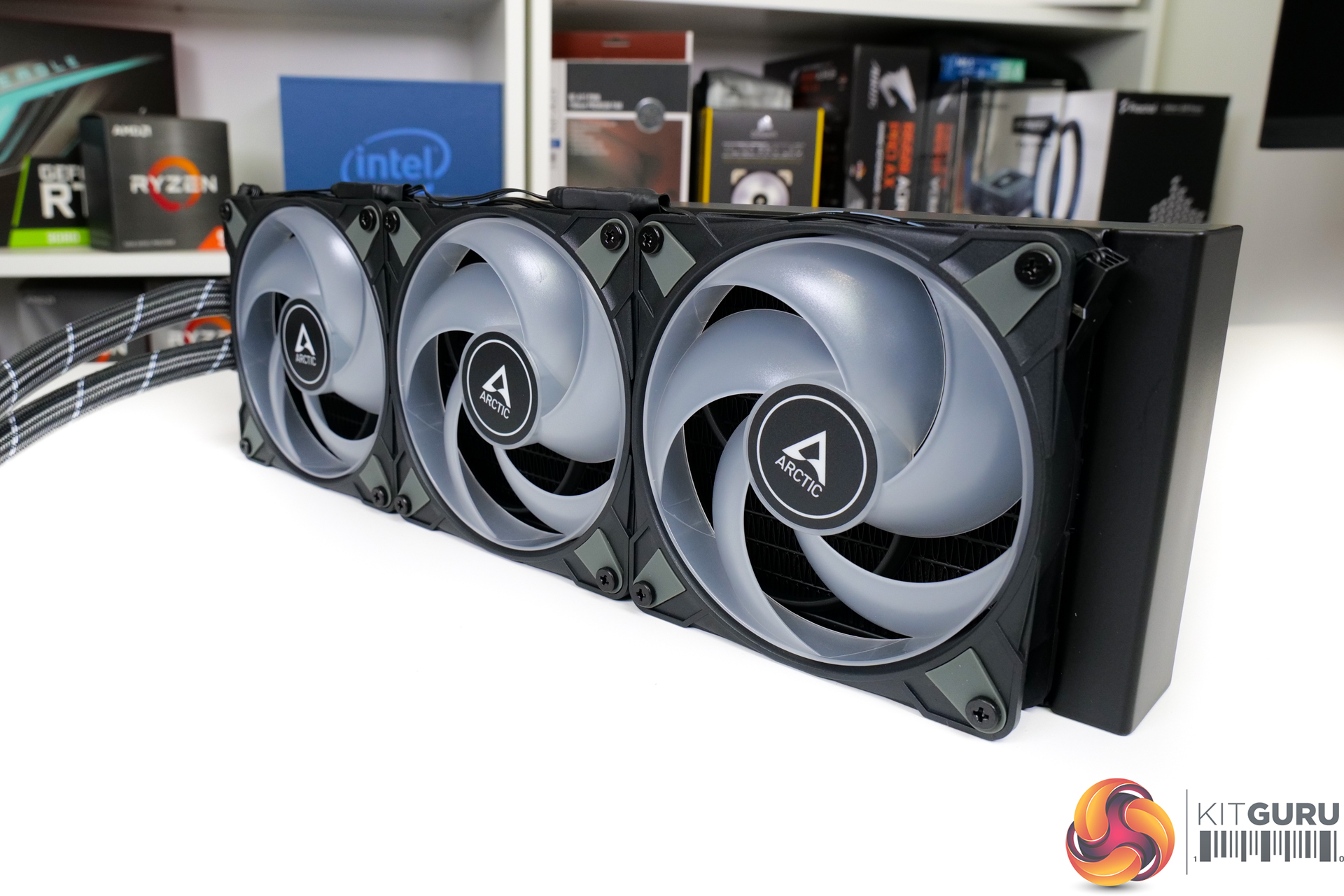 Looking at the radiator, Arctic is using a thicker-than-standard radiator. The all-black, aluminium unit comes in at 38mm-thick which is a sizable increase versus the conventional 27mm-thick units we see from the Asetek stable.