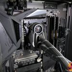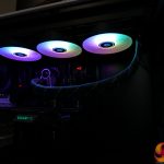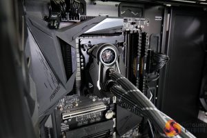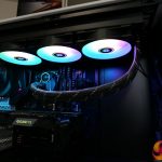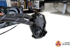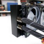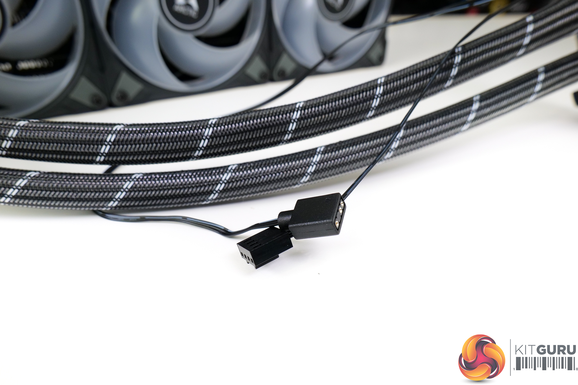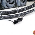 It also has the benefit of allowing the entire cooler to be handled by just two cables connected to the motherboard – one ARGB header for LED lighting and the 4-pin PWM header which manages the three radiator fans, pump, and VRM fan. The associated cables for fan and LED control are either pre-routed via the daisy-chain, or they are hidden inside the mesh wrap around the liquid cooling tubes.