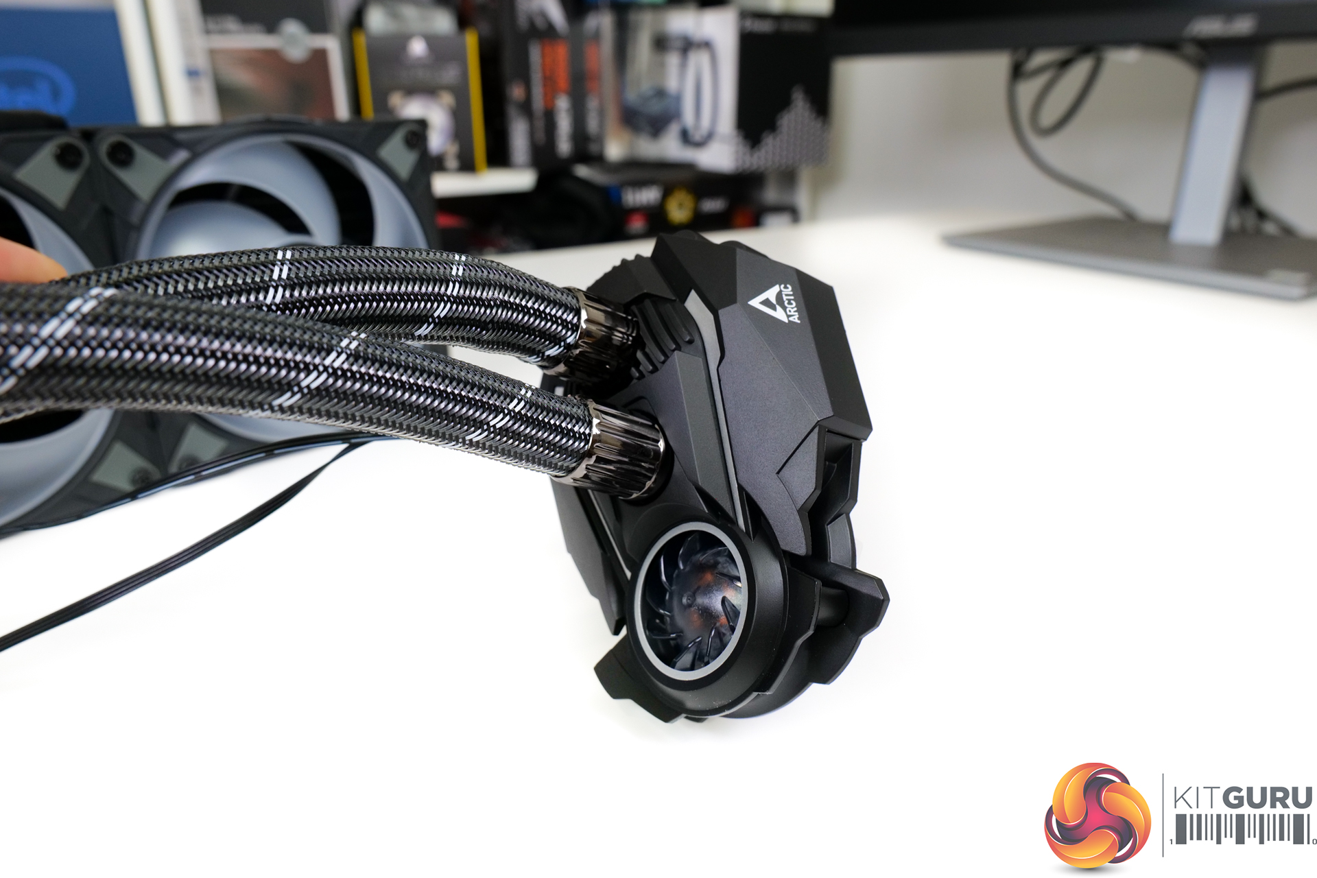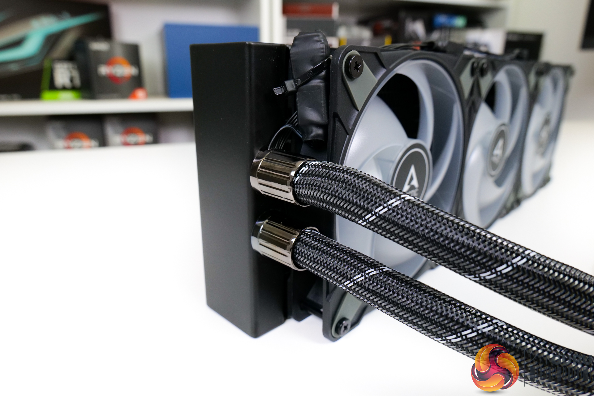 Leaving the radiator are two closely mounted fibre-reinforced, EPDM tubes that measure in at 450mm long. Arctic uses a plastic style for the tubes which is not as clean or premium looking as some of the all-black nylon braided designs from the likes of Fractal and NZXT.