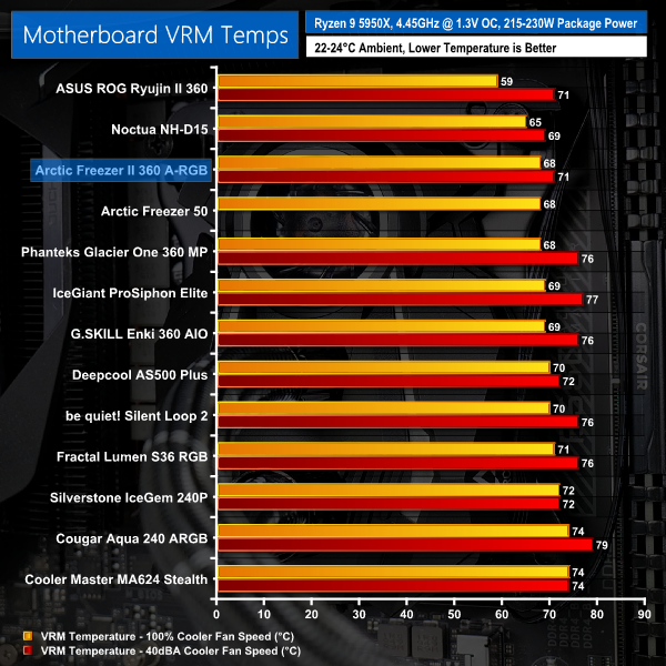We highlight VRM temperatures when using each cooler on our Gigabyte B550 Aorus Master motherboard with the overclocked Ryzen 9 5950X. Do note that the results are heavily influenced by the specific layout of the Gigabyte B550 Aorus Master test motherboard with respect to top-side or rear IO-side VRM components. So your findings may vary if you have a different motherboard VRM layout and heatsink design.