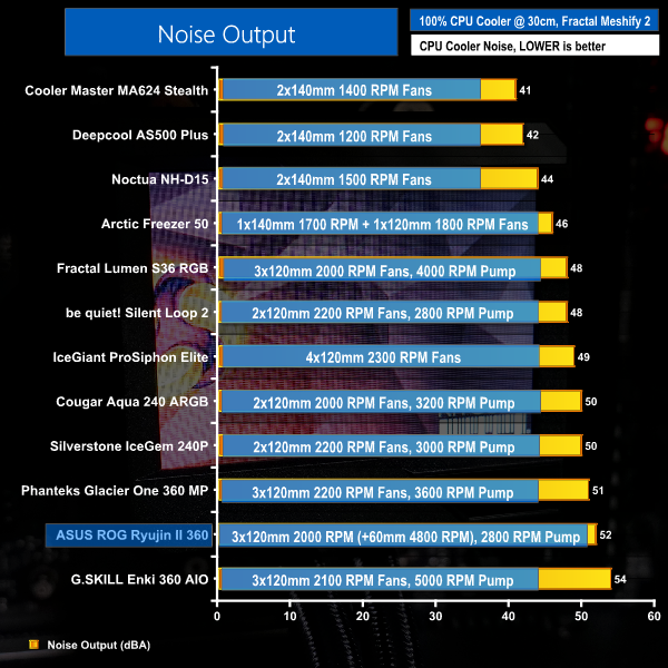 Despite using a trio of high-quality Noctua fans, it is clear that noise performance is not a particular strength of the ROG Ryujin II 360 AIO at full fan speeds.