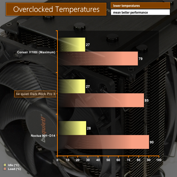 With heat turned up via the application of a 4.5GHz overclock and 1.325V core voltage, the be quiet! Dark Rock Pro 3 still manages impressive numbers against Noctua's D14. Outperforming the former Austrian king by 5°C (5.5%), the Dark Rock Pro 3 has proven that it can handle the high thermal loads that Intel's 4770K can project. Corsair's H100i still manages a lead over both air coolers, though.