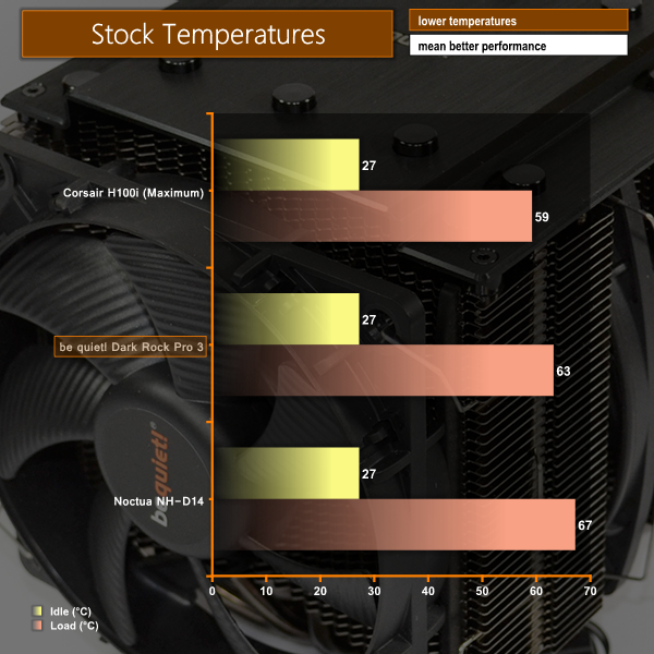 The Dark Rock Pro 3 manages a good start in stock speed cooling tests. be quiet!'s model outperforms its Noctua competitor by 4°C (6%) under a stock-clocked load. Neither of the dual tower air coolers can match the stock CPU thermal performance of Corsair's H100i closed-loop liquid cooler; the H100i outperforms the DRP 3 by 4°C (just over 6%).
