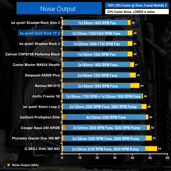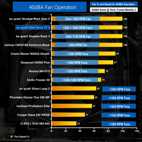 As 100% fan speed tied into a 40dBA noise output, no further tuning was required to reach such a tolerable noise level. Bear this in mind when comparing the Dark Rock TF 2 cooler's data versus other units which typically run louder (with the exception of a couple of other be quiet! coolers and the 135mm-class Zalman model).